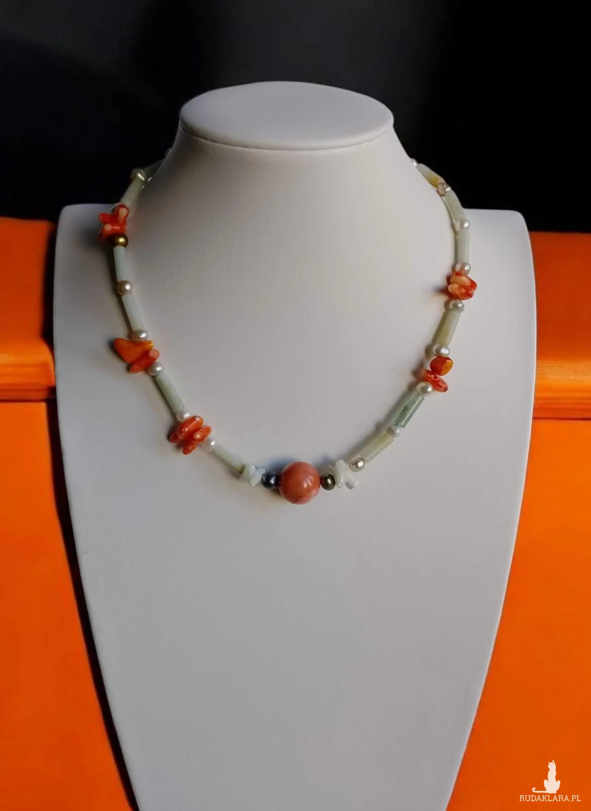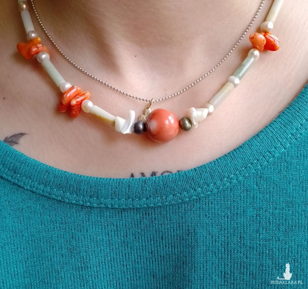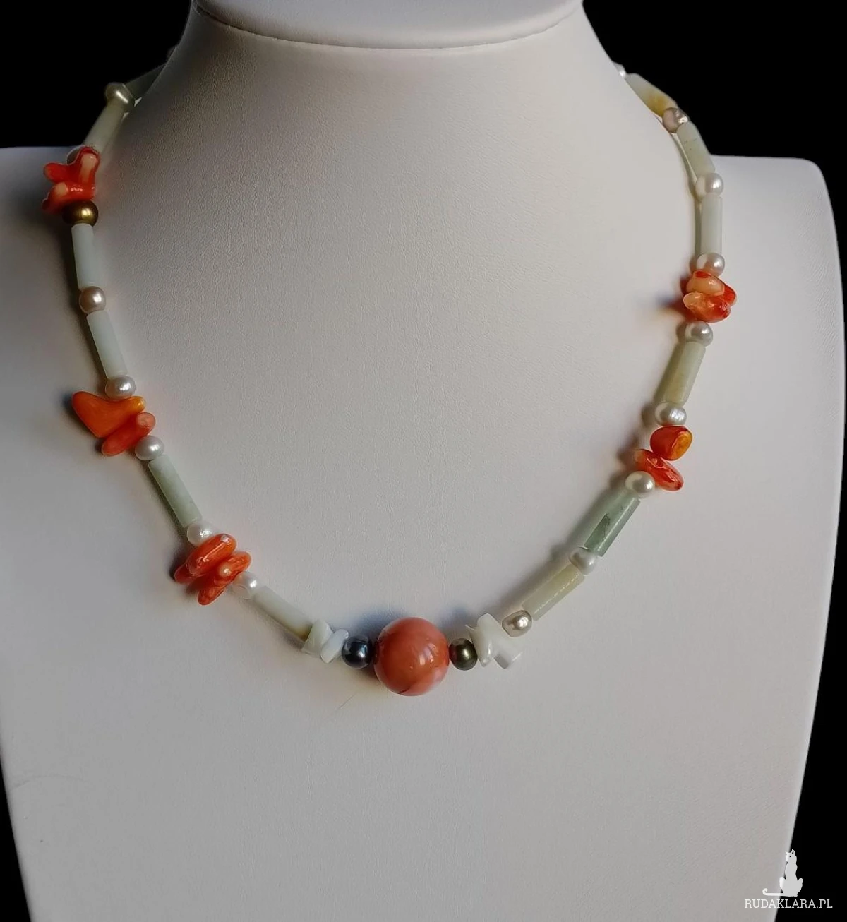 Naszyjnik wykonany z walców z awenturynu w rozmiarze 13 x 4 mm przełożonych perełkami słodkowodnymi oraz naturalnym koralowcem. W centralnej części umieszczona jest 15 mm kula z korala naturalnego. Elementy metalowe ze stali szlachetnej. Długość naszyjnika 43 cm, zapięcie na karabińczyk 10 mm. Idealna ozdona dekoltów do wiosenno - letnich stylizacji.