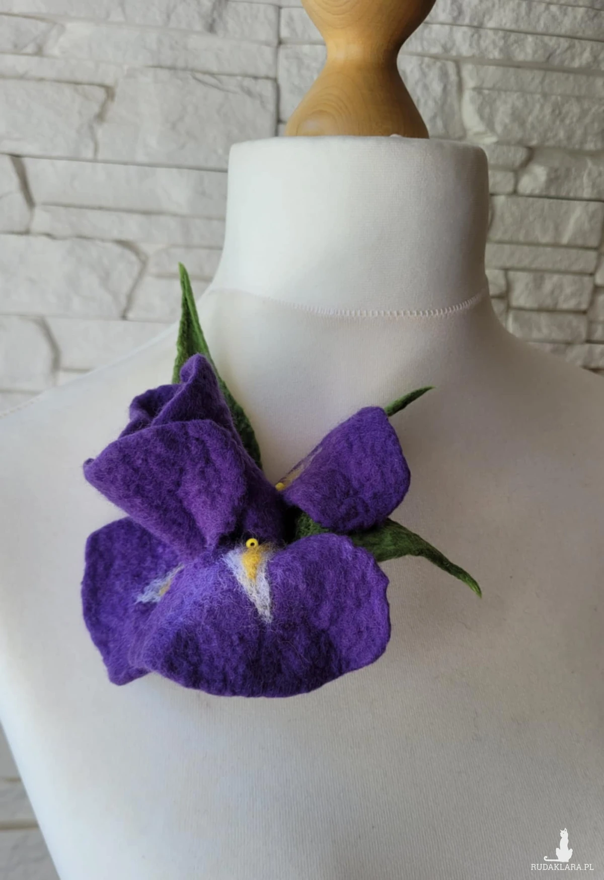 Broszka irys wykonana techniką filcowania na mokro z wełny merynsa australijskiego.