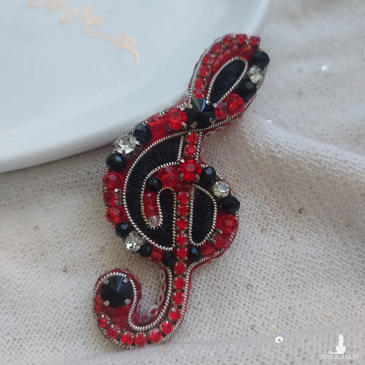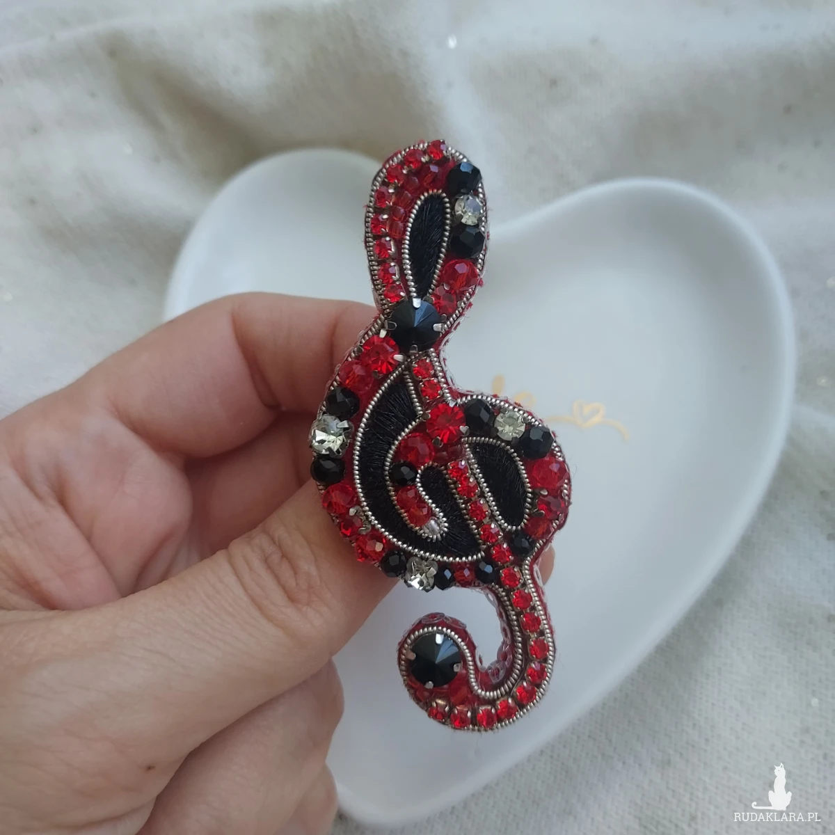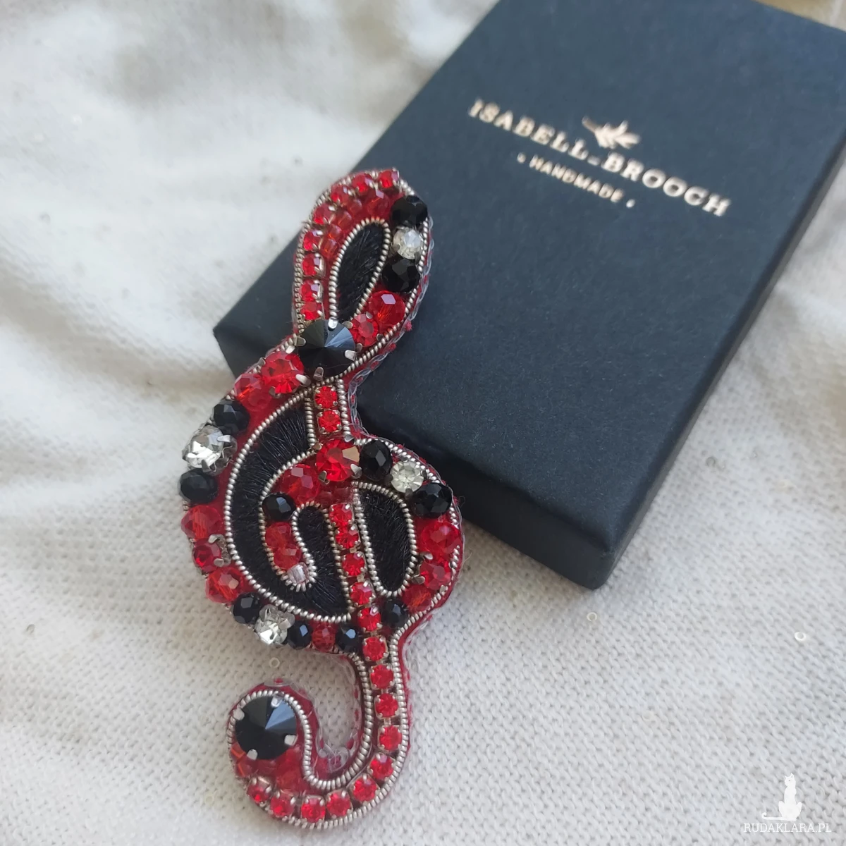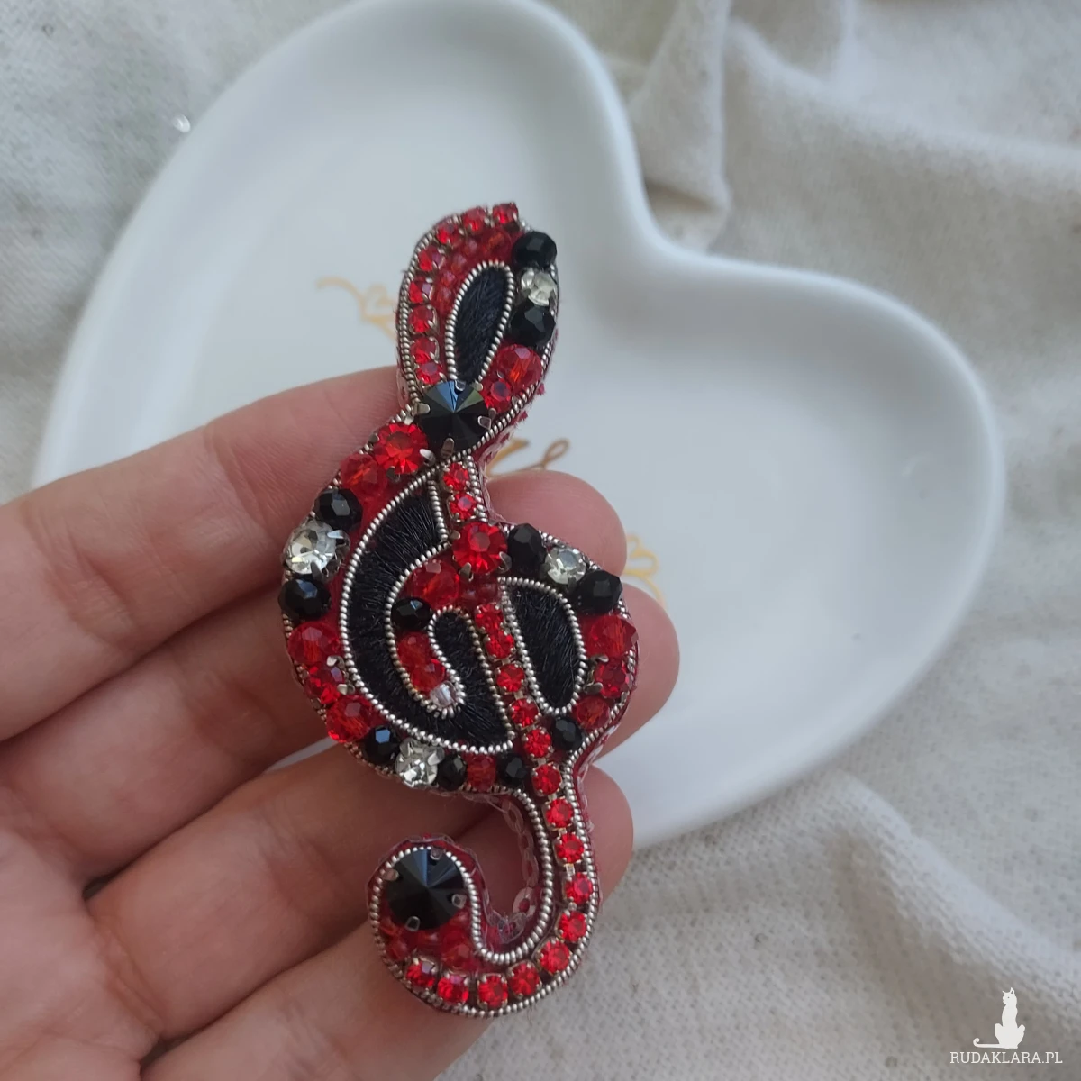 Broszka klucz wiolinowy w kolorze czerwono-czarnym dla miłośników muzyki, ale nie tylko!
