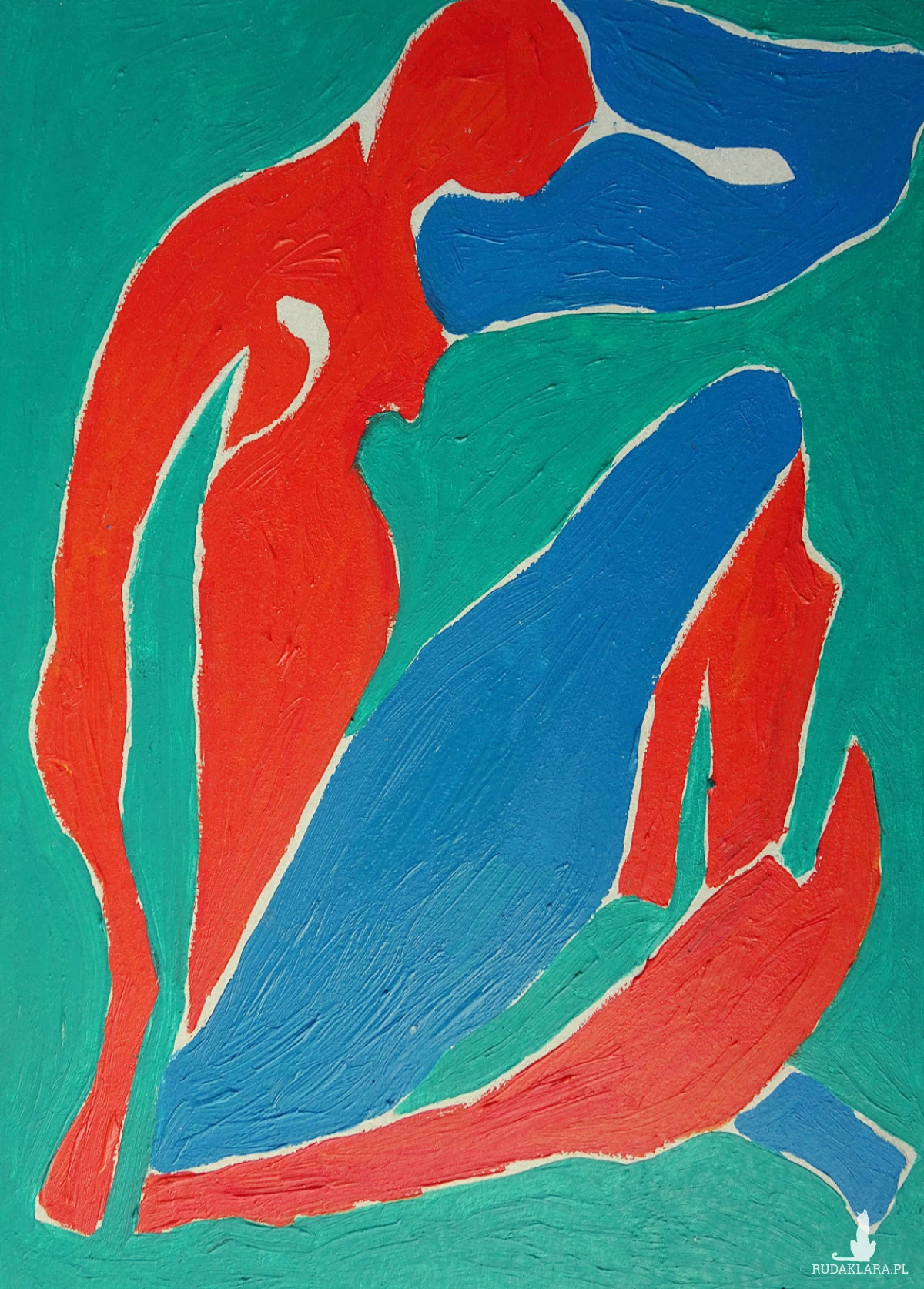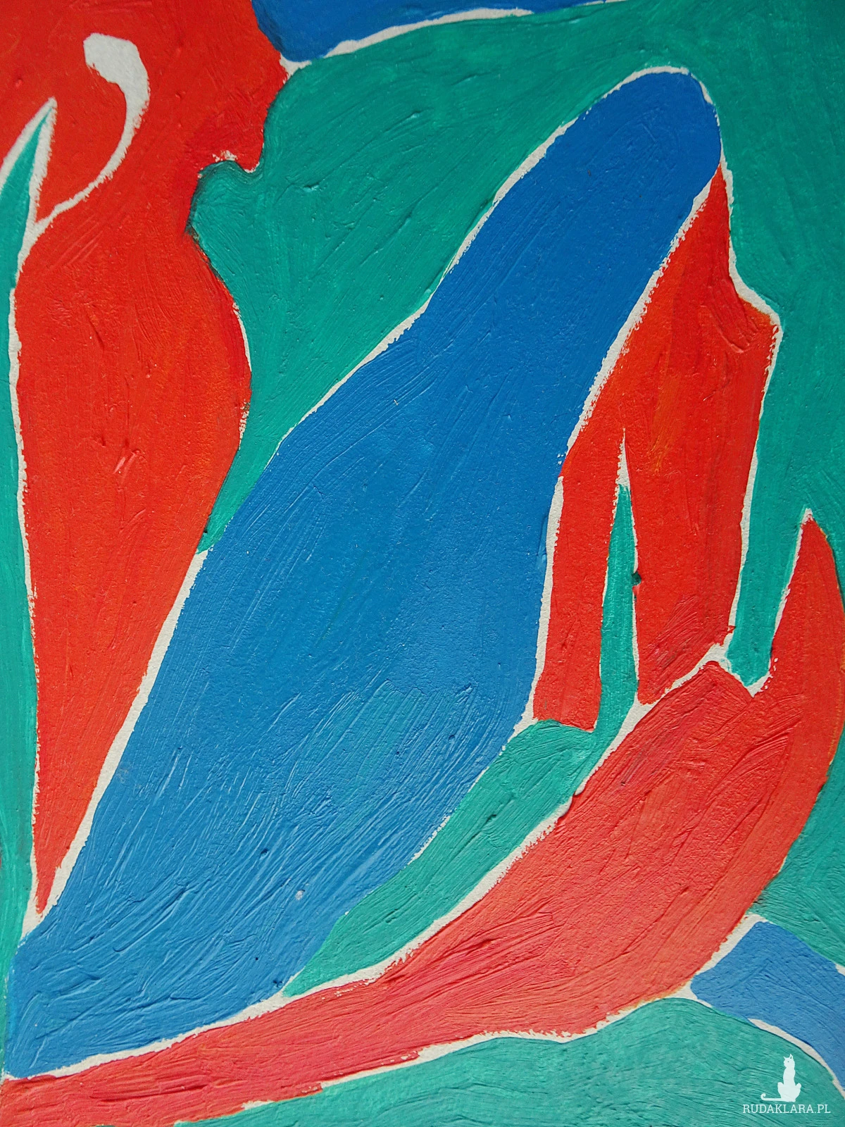 Na obrazie dominują jaskrawe kolory: głęboki czerwony w kontraście z niebieskim i zielonym tłem. Kształty są abstrakcyjne, ale coś tam sugeruje postać człowieka. Kompozycja jest dynamiczna. Linie są płynne, a krawędzie wyraźne. Atmosfera przypomina mi letnie słońce, pełna energii, ale też tajemnicy. Artysta użył techniki impasto, co widać w grubych warstwach farby i teksturze. Styl nawiązuje do ekspresjonizmu, gdzie forma ustępuje emocji. Obraz może wywoływać poczucie ruchu i siły. Może też powodować trochę zastanowienia. Czy to radość, czy może smutek? Patrząc na to, chciałoby się krzyknąć: Wow! Jakie to niesamowite! to wygląda jak wielka plama! Prace takie jak ta pozwalają nam na chwilę oderwać się od codzienności i zanurzyć się w świat koloru. To takie "awesome", jakby powiedzieli Anglicy. Patrząc na to, czuję, jakby energia wprost z obrazu przepływała do mnie.