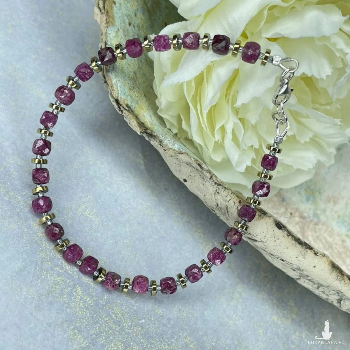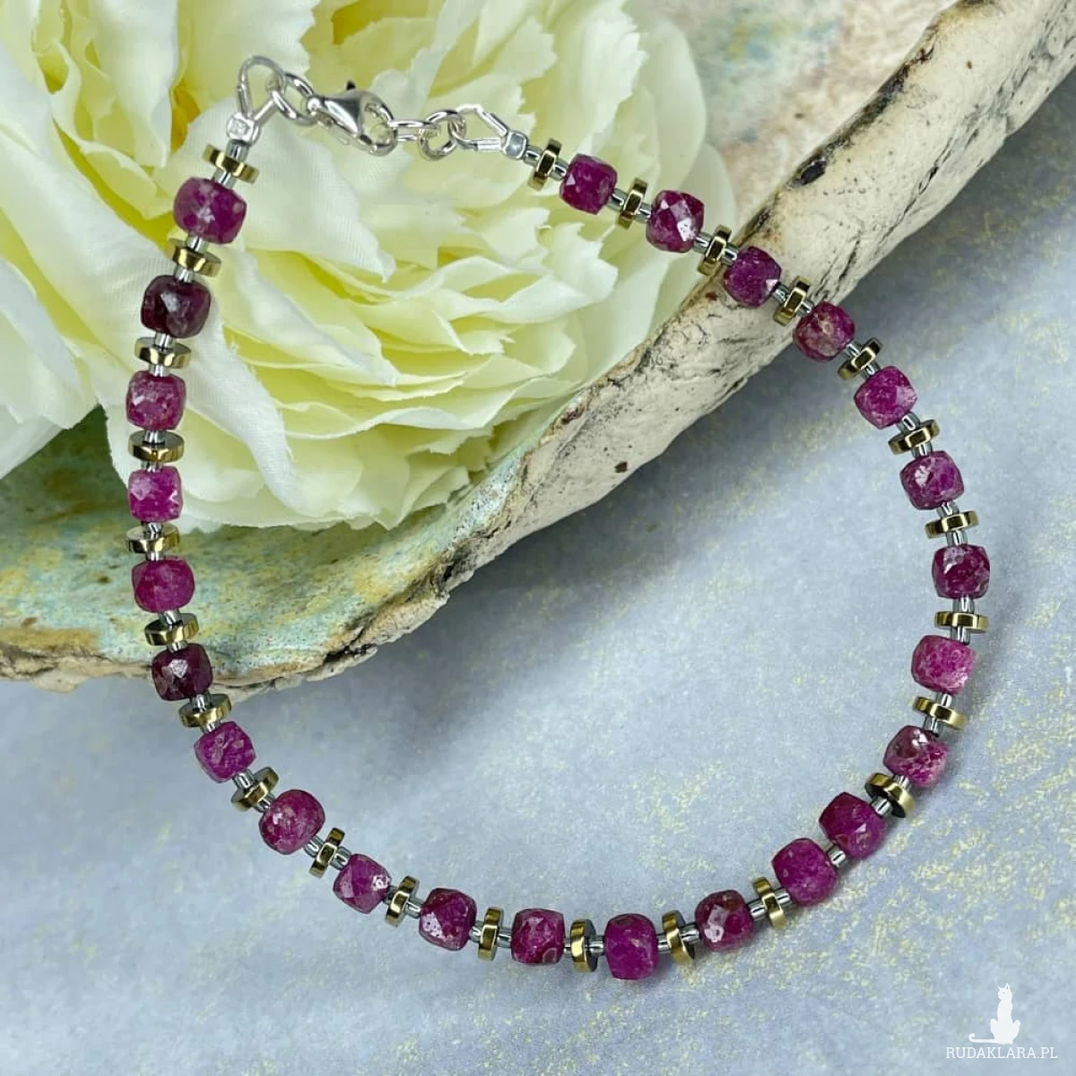 Srebrna bransoletka z rubinami to elegancka propozycja dla osób ceniących ponadczasowy urok kamieni szlachetnych w klasycznej formie. Rubin, od wieków symbolizujący miłość i pasję, przyciąga uwagę głęboką barwą, która pięknie kontrastuje z jasnym srebrem. Całość uzupełniają subtelne akcenty hematytu i drobnych koralików Toho, tworząc harmonijną kompozycję idealną zarówno na co dzień, jak i na wyjątkowe okazje.
