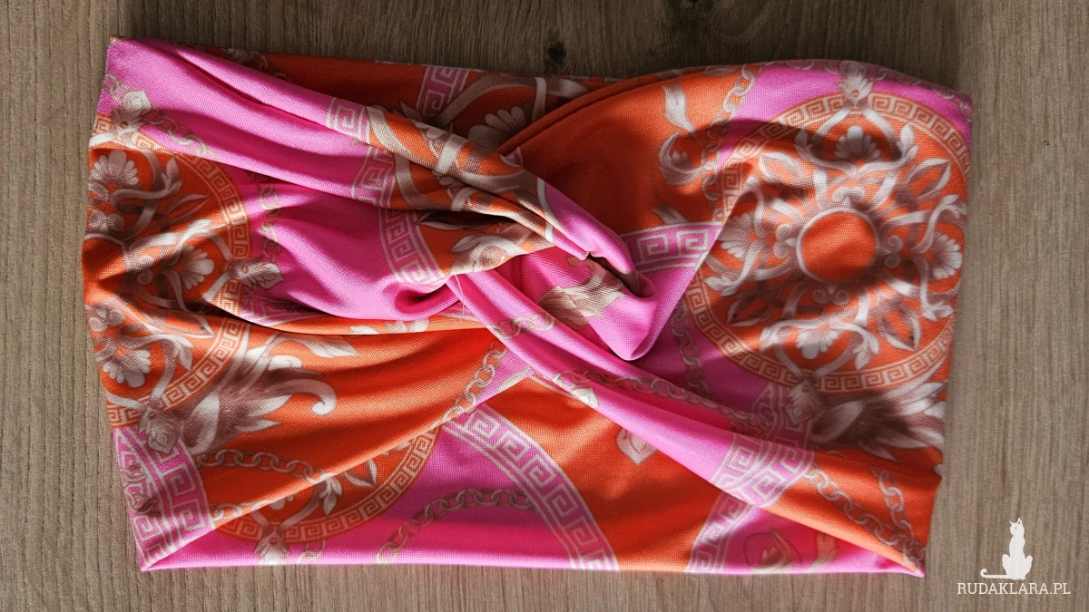 Oto opis kolorowej, ręcznie szytej opaski na głowę z dzianiny:
