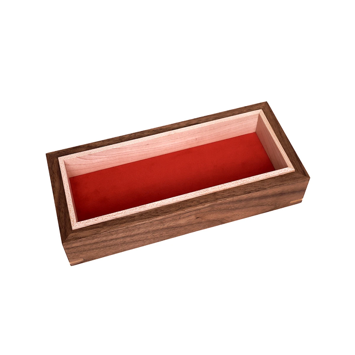 Wewnętrzne ścianki szkatułki na biżuterię zostały wykończone drewnem klonowym, którego naturalna jasna barwa rozświetla wnętrze szkatułki i stanowi bardzo atrakcyjny kontrast do ciemnej barwy orzecha amerykańskiego, z którego wykonany jest korpus szkatułki.