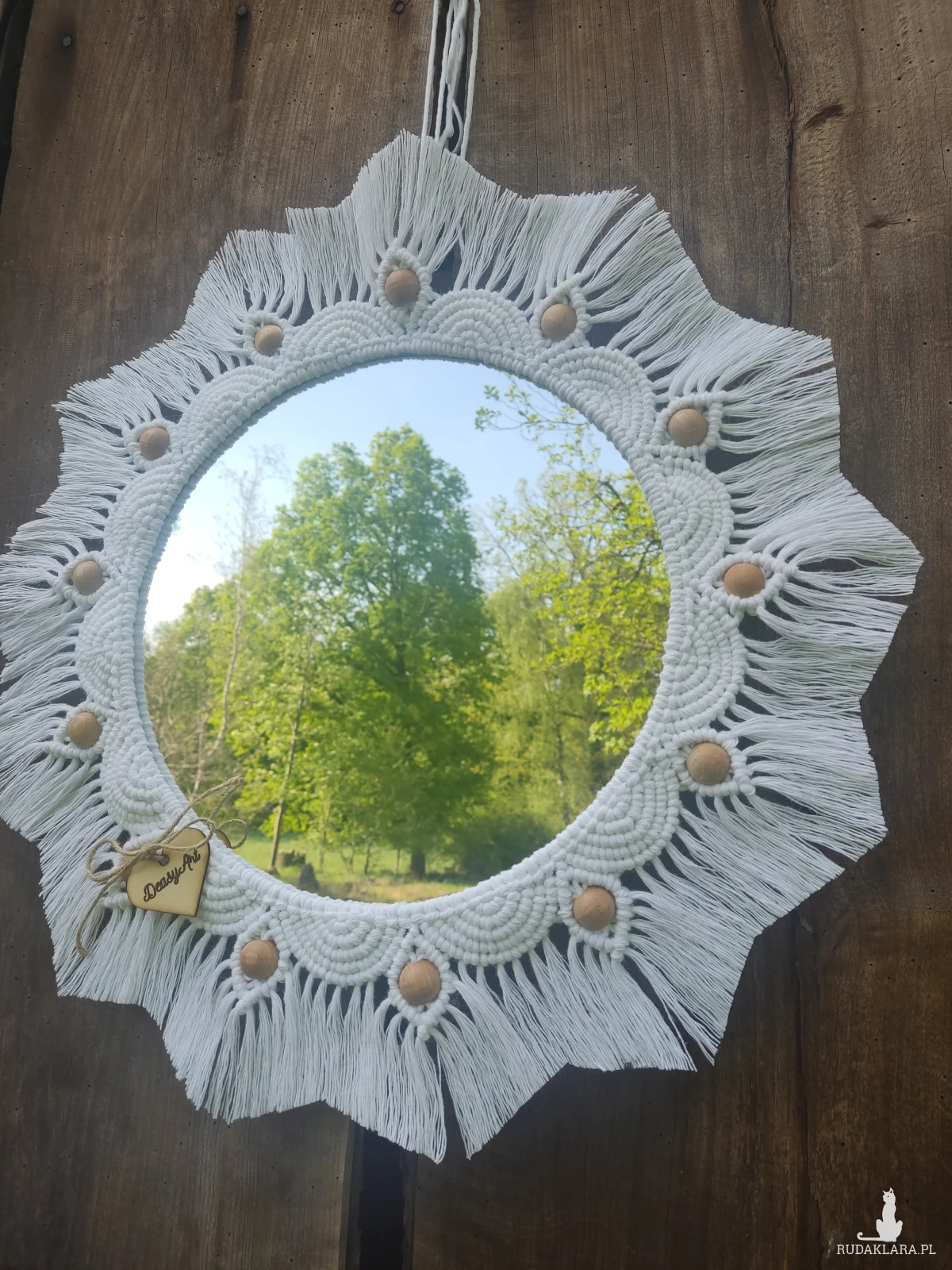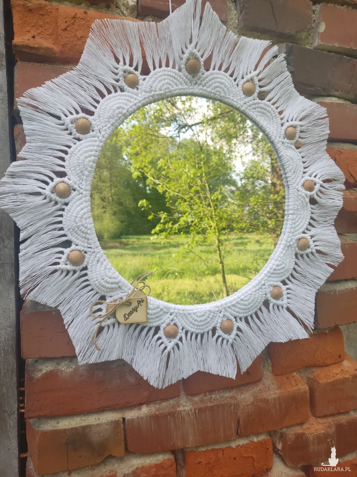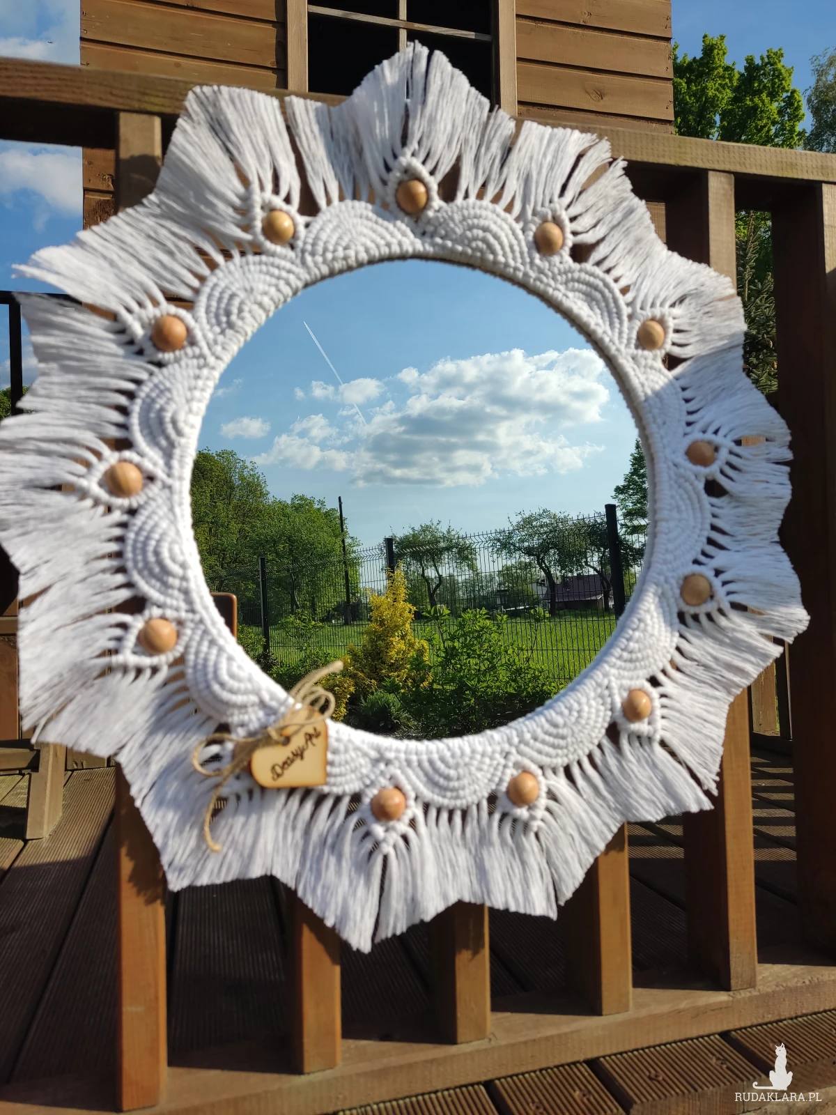 Sprzedam nowe ręcznie wykonane makramowe lustro w stylu Boho. Średnica całości wynosi 50 cm natomiast średnica samego lustra wynosi 30 cm.