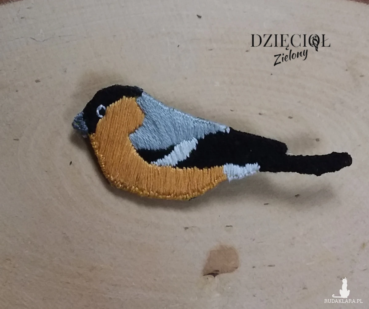 Ręcznie szyta broszka gil (samica) wykonana haftem płaskim. Idealny dodatek dla miłośników przyrody 🙂