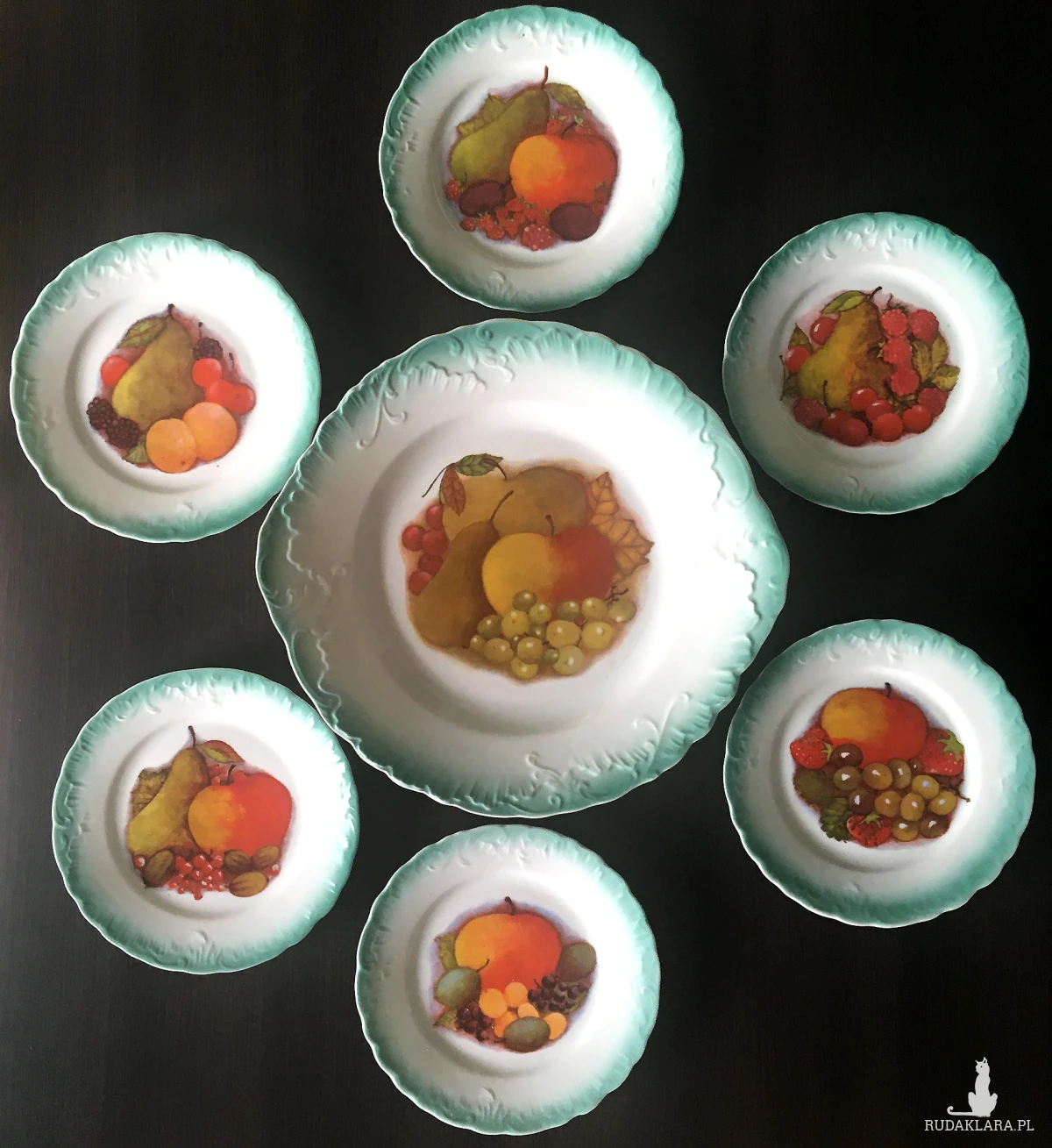 Wszystkie talerze posiadają namalowaną dekorację w różne owoce. Brzegi talerzy są uroczo zdobione. Na każdym talerzyku owoce są inne. Komplet jest w bardzo dobrym stanie, nie był używany.