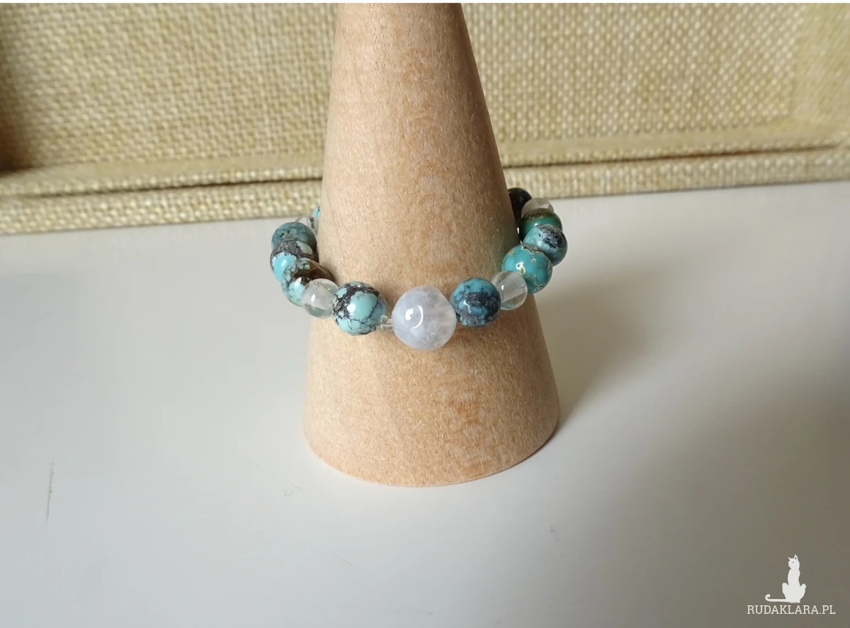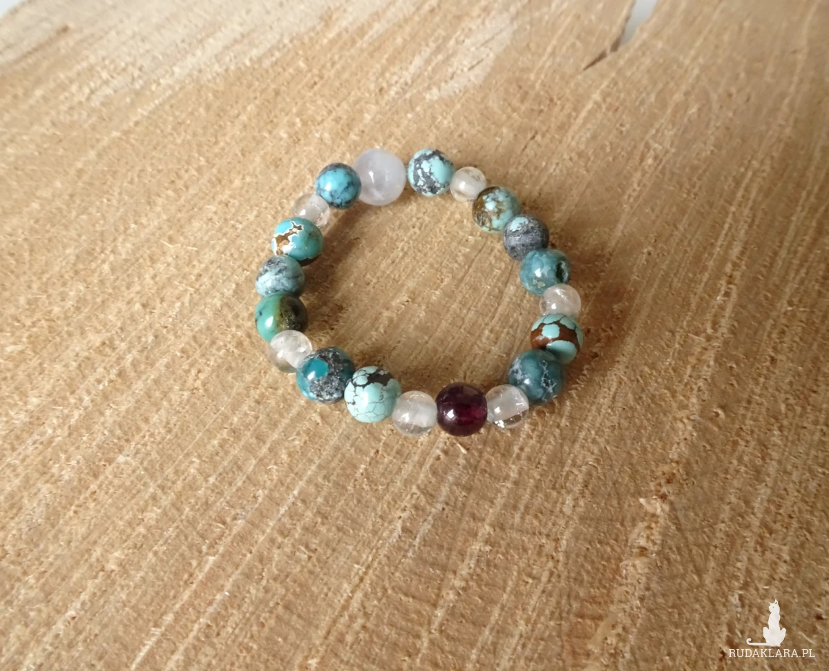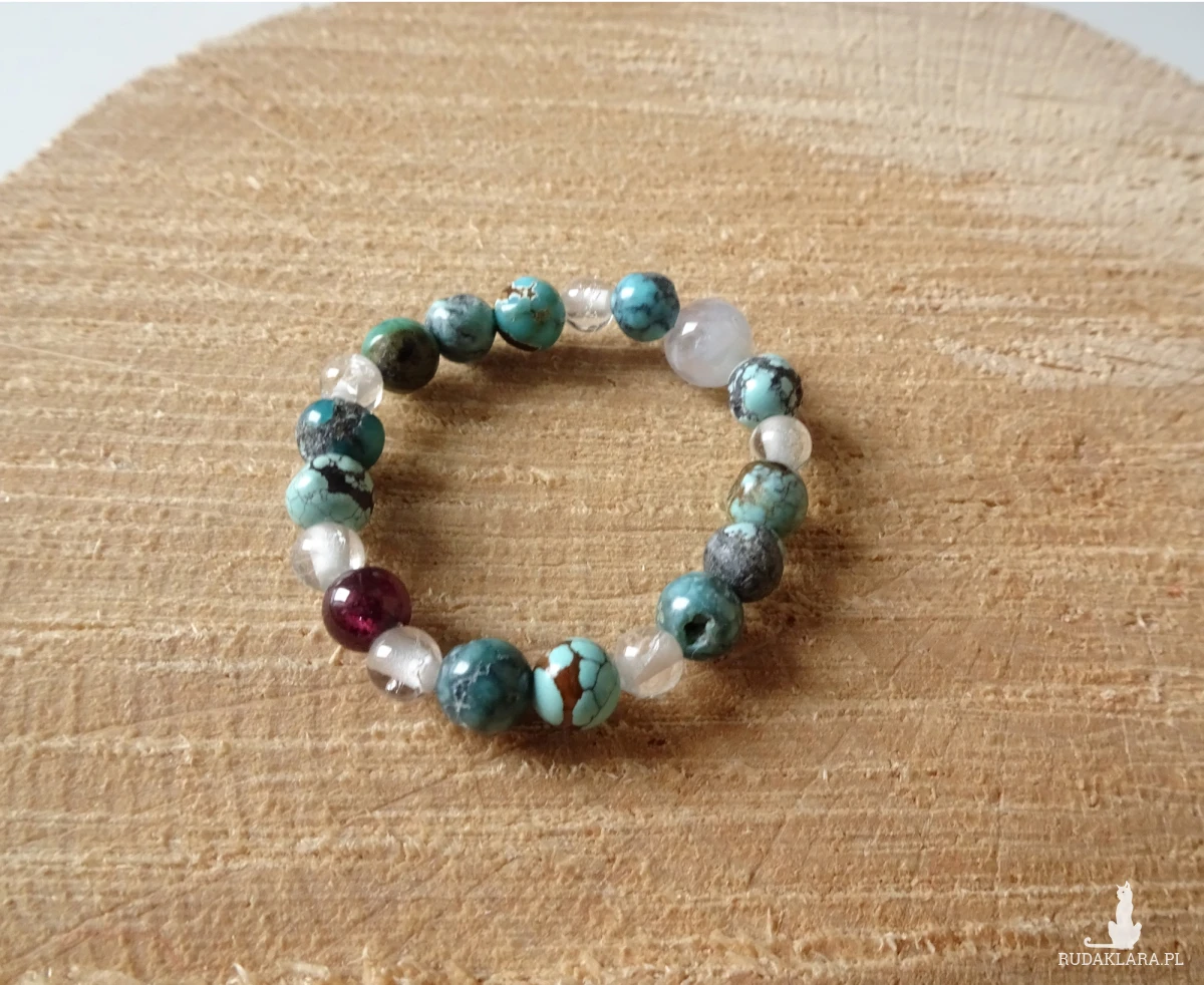 Pierścionek ochronny wykonany z turkusu, niebieskiego chalcedonu, kryształu górskiego i granatu wielkości od 3 do 4mm, na silikonowej gumce. Rozmiar regulowany. Średnica wewnętrzna bez naciągnięcia ok. 2cm.