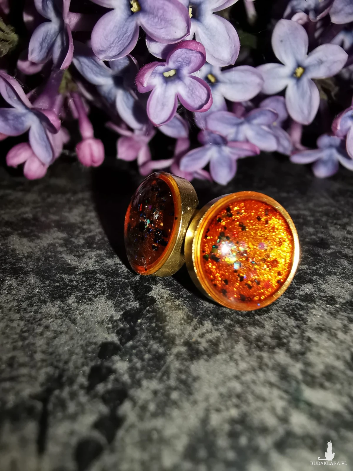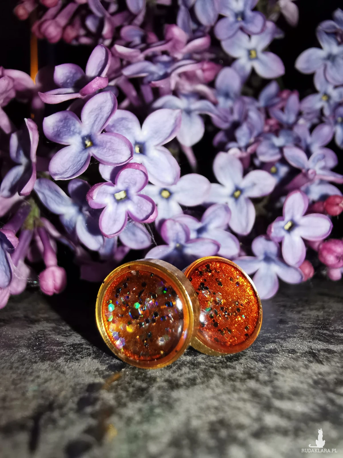 Drobne kolczyki stalowe, ręcznie wypełnione żywicą epoksydową i brokatami.
