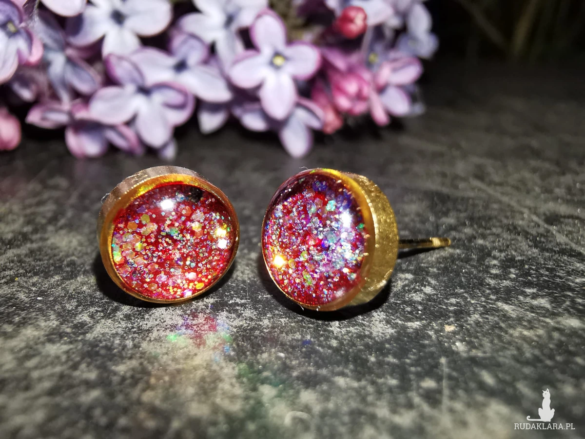 Drobne kolczyki stalowe, ręcznie wypełnione żywicą epoksydową i brokatami.