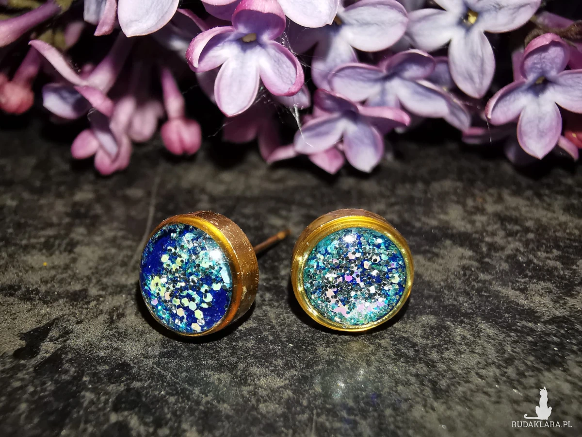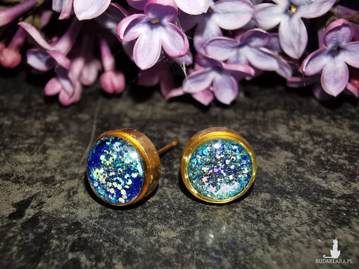 Drobne kolczyki stalowe, ręcznie wypełnione żywicą epoksydową i brokatami.
