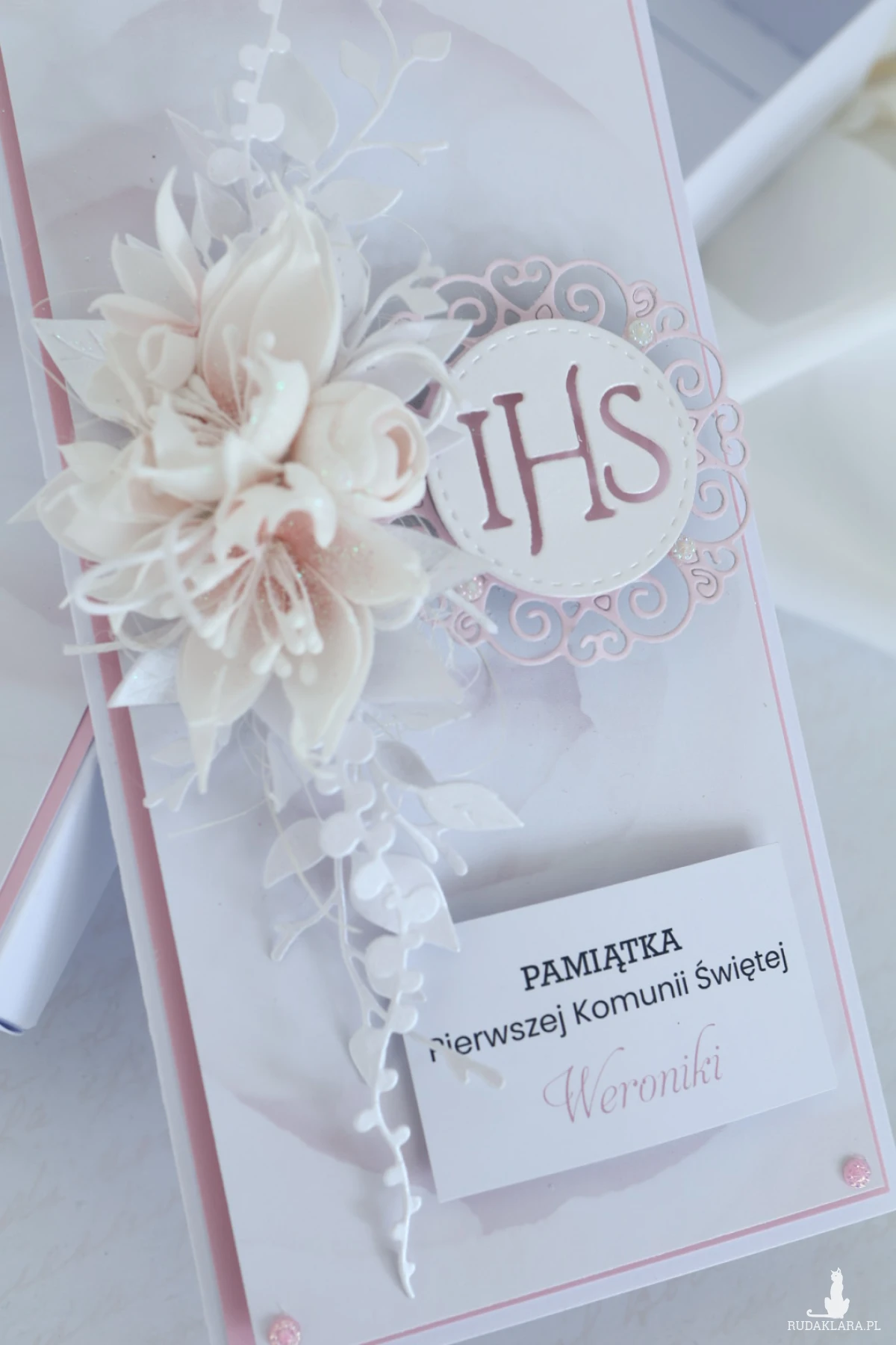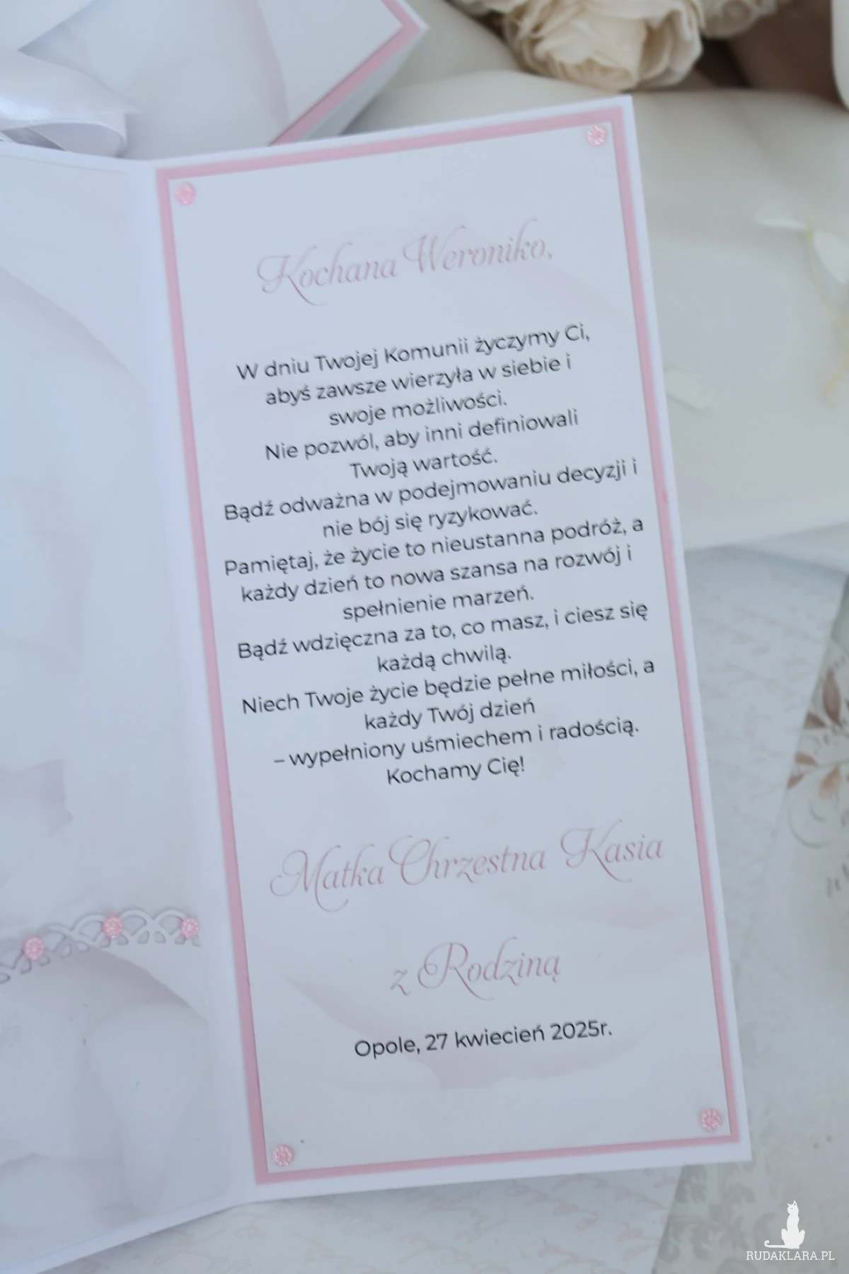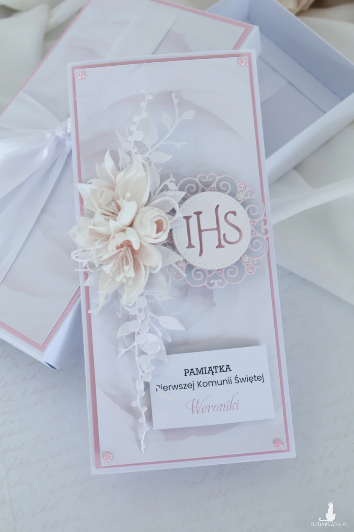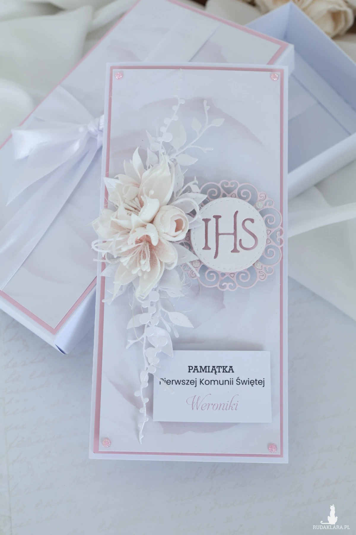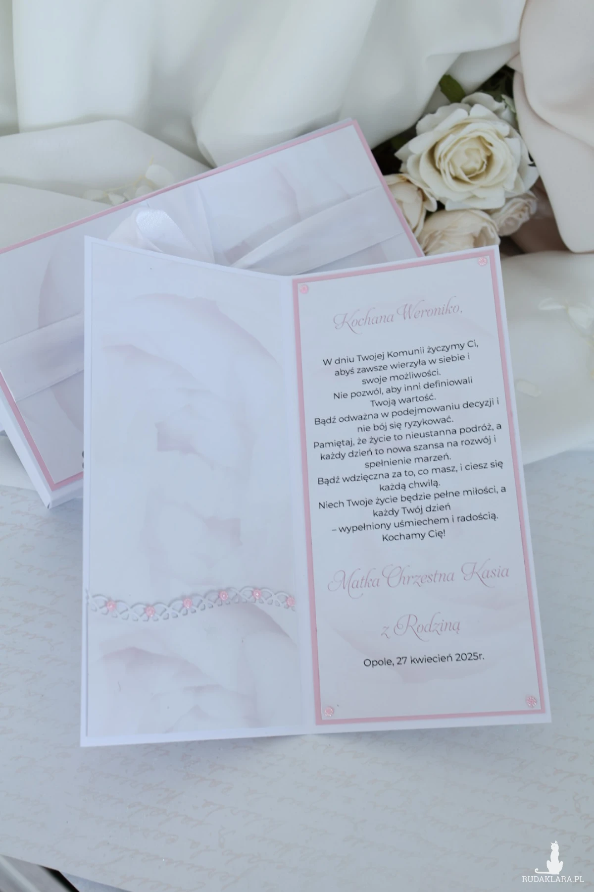 Ręcznie wykonana w delikatnych odcieniach bieli i różu, ozdobiona ręcznie tworzonymi kwiatami, powstała z myślą o wyjątkowym dniu Pierwszej Komunii Świętej.