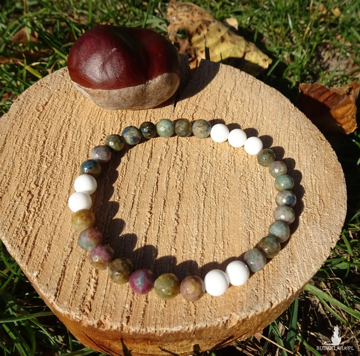 Bransoletka z fasetowanych kulek epidotu i gładkich białej muszli wielkości 6mm, na silikonowej gumce.