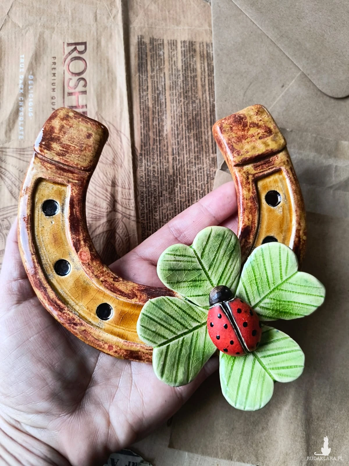 Podkowa ceramiczna z koniczyną na szczęście, wykonana z gliny szamotowej, wypalona na biskwit a następnie szkliwiona w temperaturze 1260 stopni o wymiarach: 13 cm x 13 cm. Do powieszenia na ścianie. Serdecznie polecam!