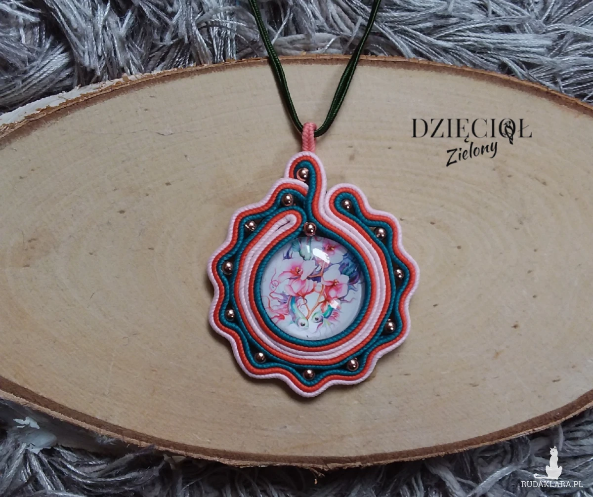 Ręcznie szyty wisiorek wykonany w technice sutasz