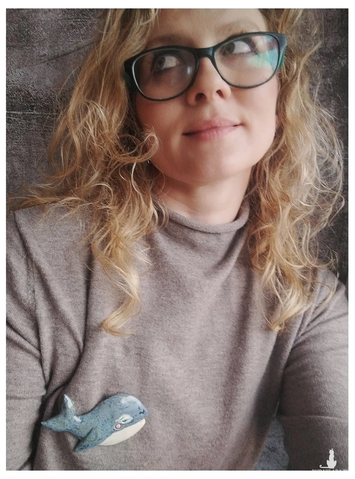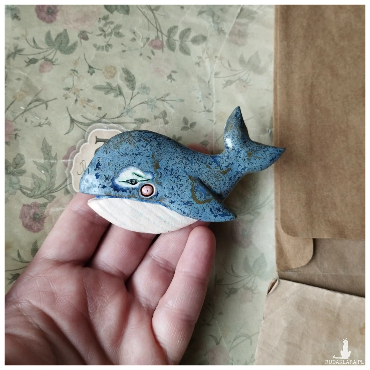 Broszka wielorybek wykonana z gliny szamotowej, wypalona na biskwit, a następnie szkliwiona w temperaturze ok 1260 stopni C. O wymiarach ok; 4,5 cm x 8,5 cm. Serdecznie polecam wszystkim Paniom poszukującym nietuzinkowej biżuterii.