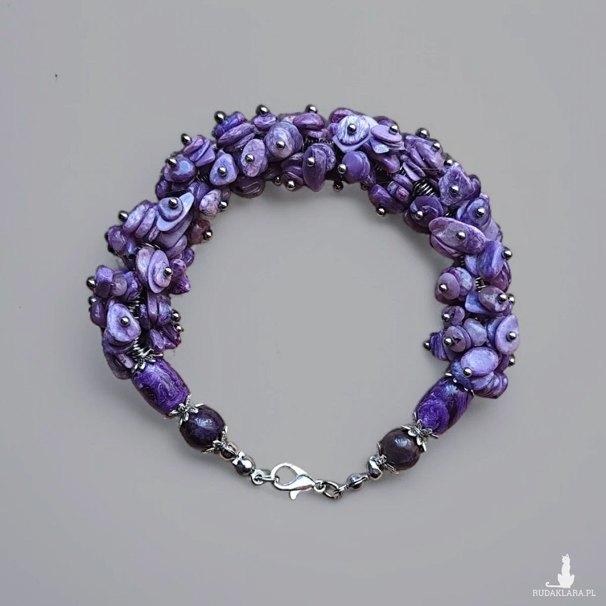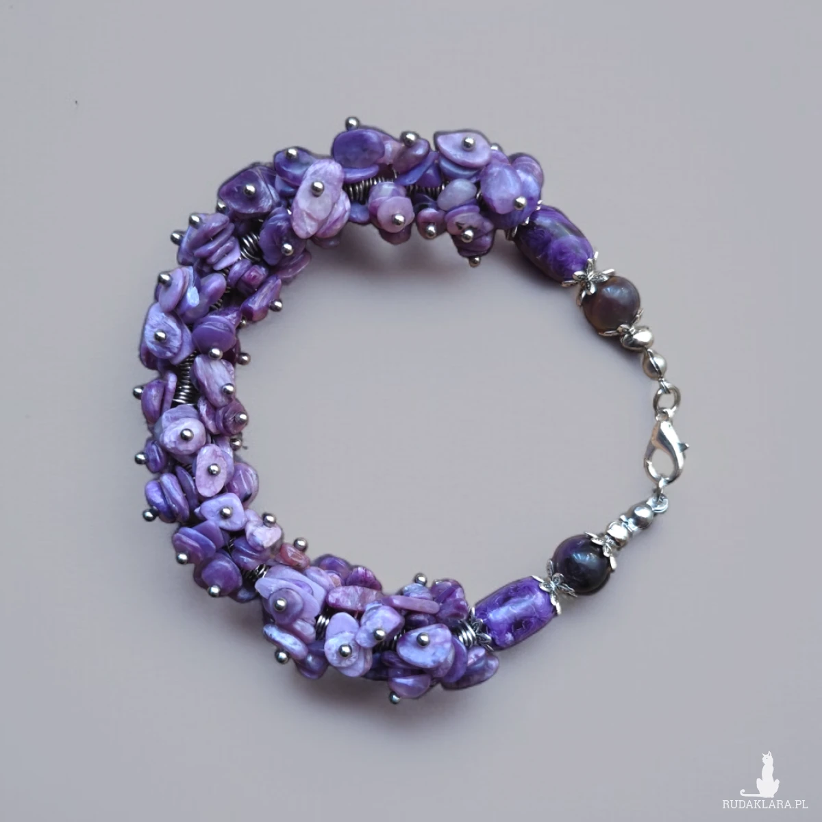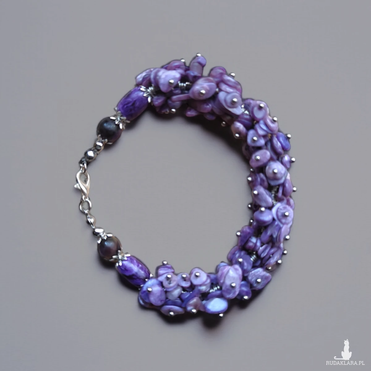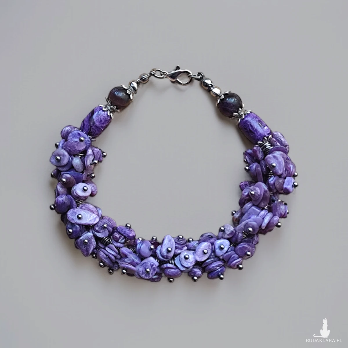 * Wykonanie: Ręcznie wykonana, z dbałością o detale. Kamienie czaroitu zostały starannie dobrane i osadzone na mocnej, podwójnej lince jubilerskiej, co gwarantuje trwałość i bezpieczeństwo noszenia.