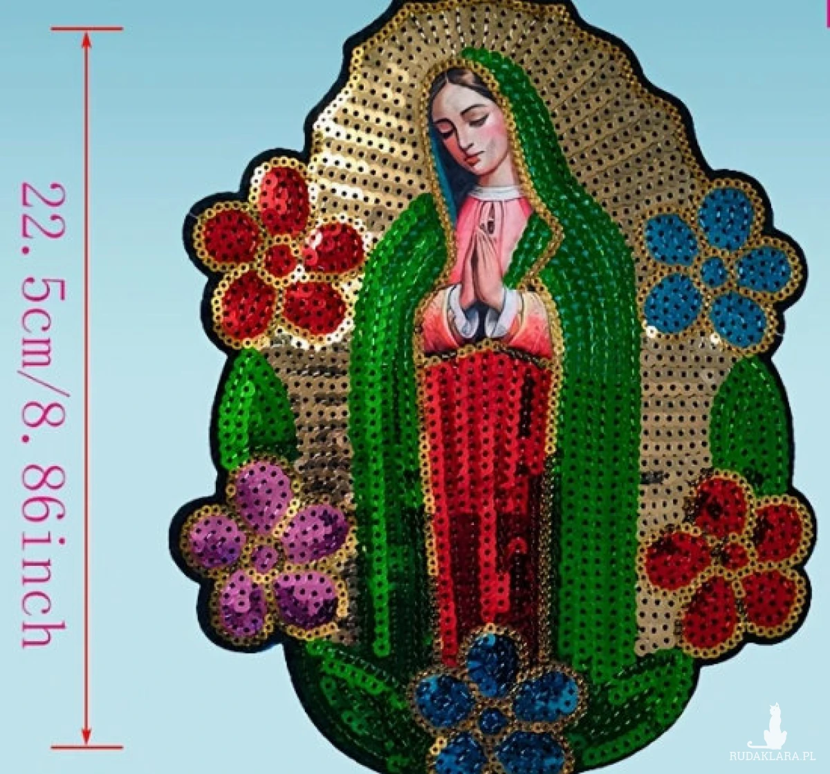 Duza cekinowa naszywka Matka Boska, piekna, swietna do naszycia na kurtke jeansowa, sweter, płaszcz. Sprowadzana ze wschodu, mega kolorowa, polecam
