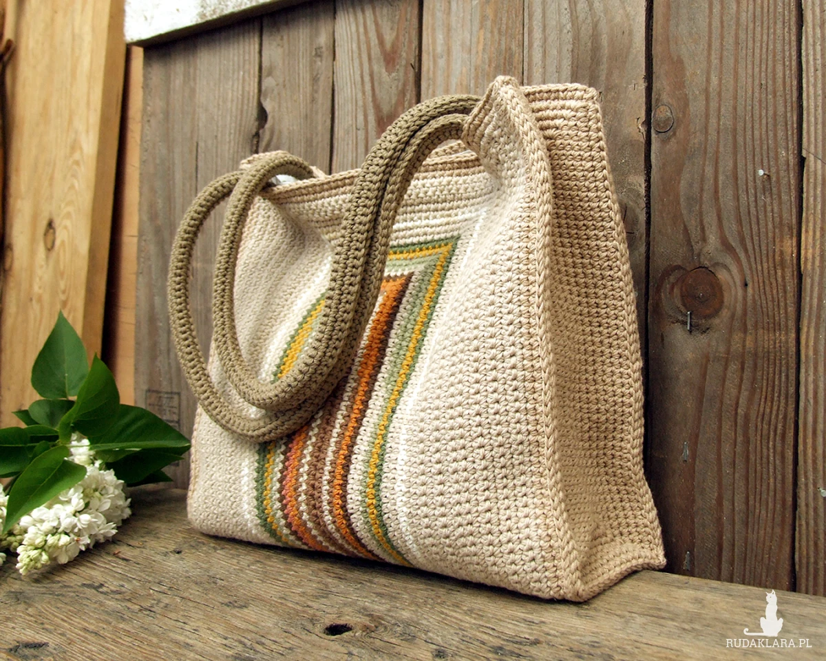 Środkową część tworzą pionowe, kolorowe paseczki, pozostała cześć, boki i rączki wykonane są z dwóch odcieni beżowego.