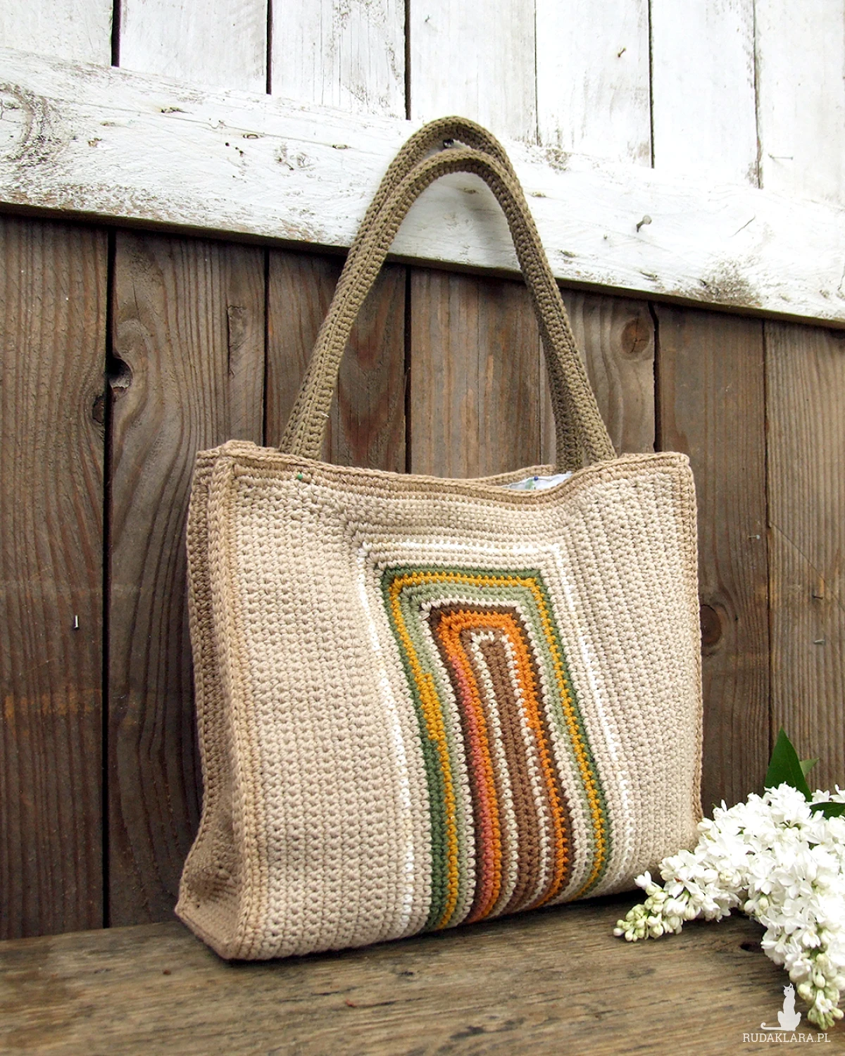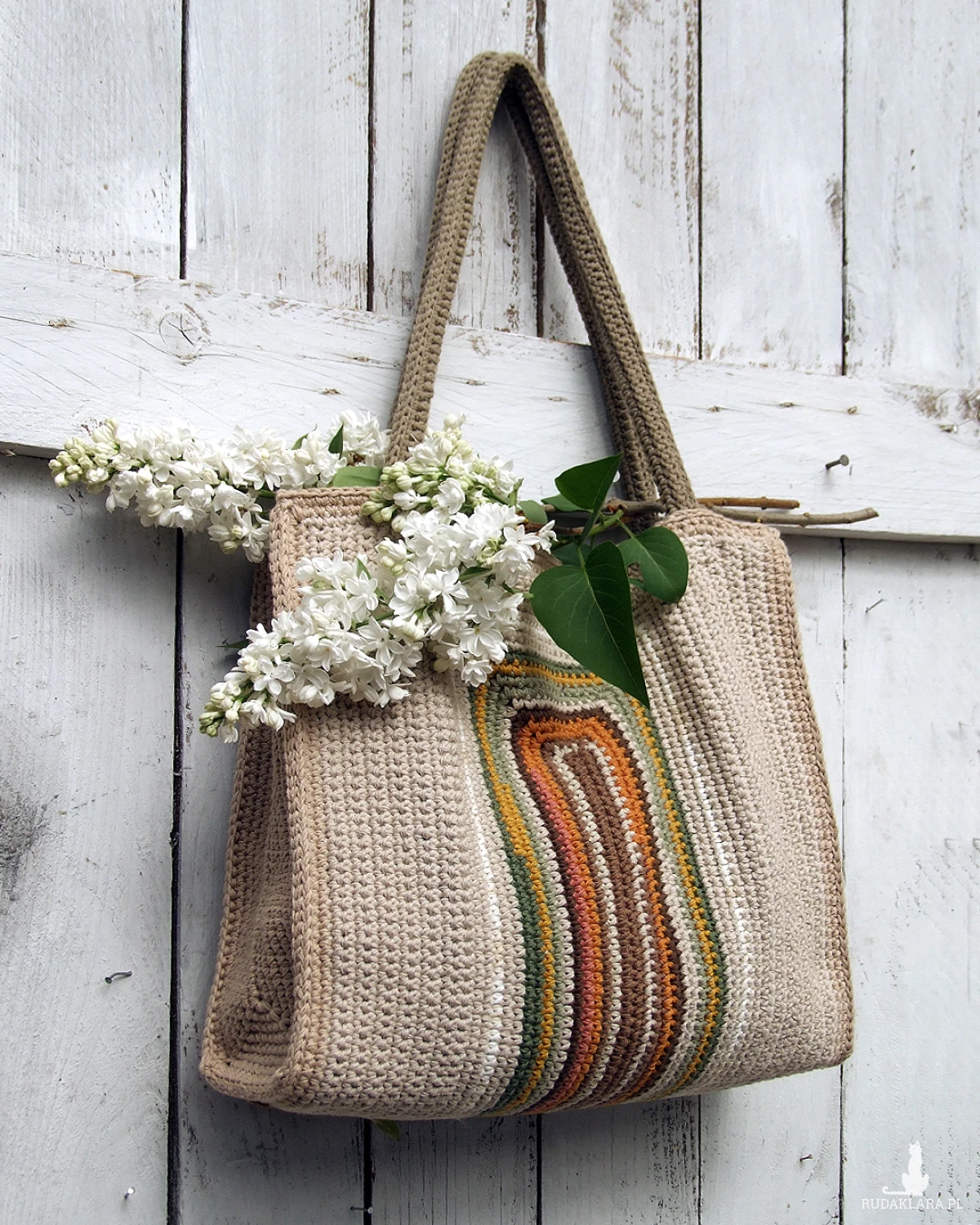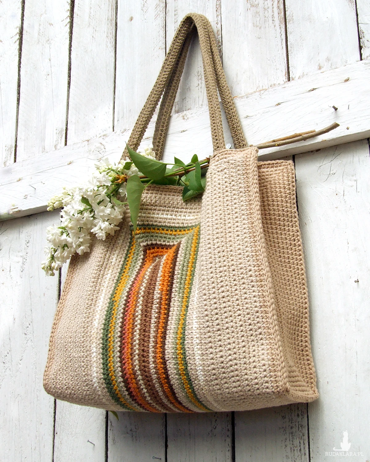 Duża torebka, wykonana ręcznie na szydełku, z bawełnianej włóczki (nie ze sznurka) - można ją nosić w ręku, dość długie rączki pozwalają także na swobodne noszenie torebki na ramieniu.
