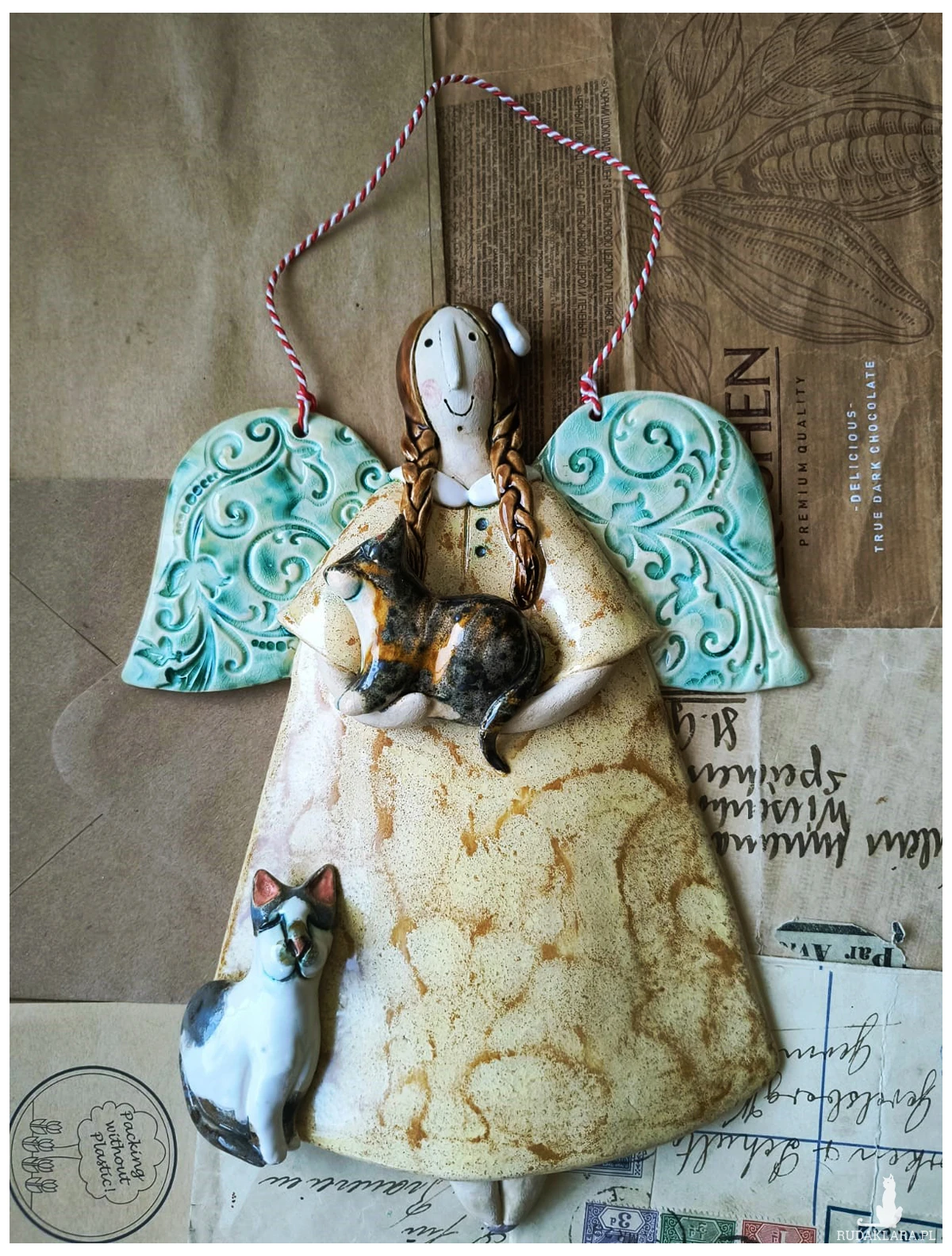 Uroczy aniołek ceramiczny wykonany z gliny szamotowej, wypalony na biskwit, a następnie szkliwiony w temperaturze 1260 stopni C. Wymiary ok 18,5 cm x 24,5 cm. Do powieszenia na ścianie na ozdobnym sznureczku. Idealny jako prezent okolicznościowy lub do ozdoby domu.