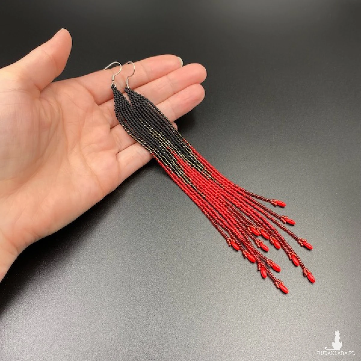 Bardzo długie i wąskie kolczyki do ramion z efektem cieniowania, zostały wykonane z najmniejszych na rynku koralików Toho 15 i Rizo. W 100% utkane ręcznie i z największą starannością.