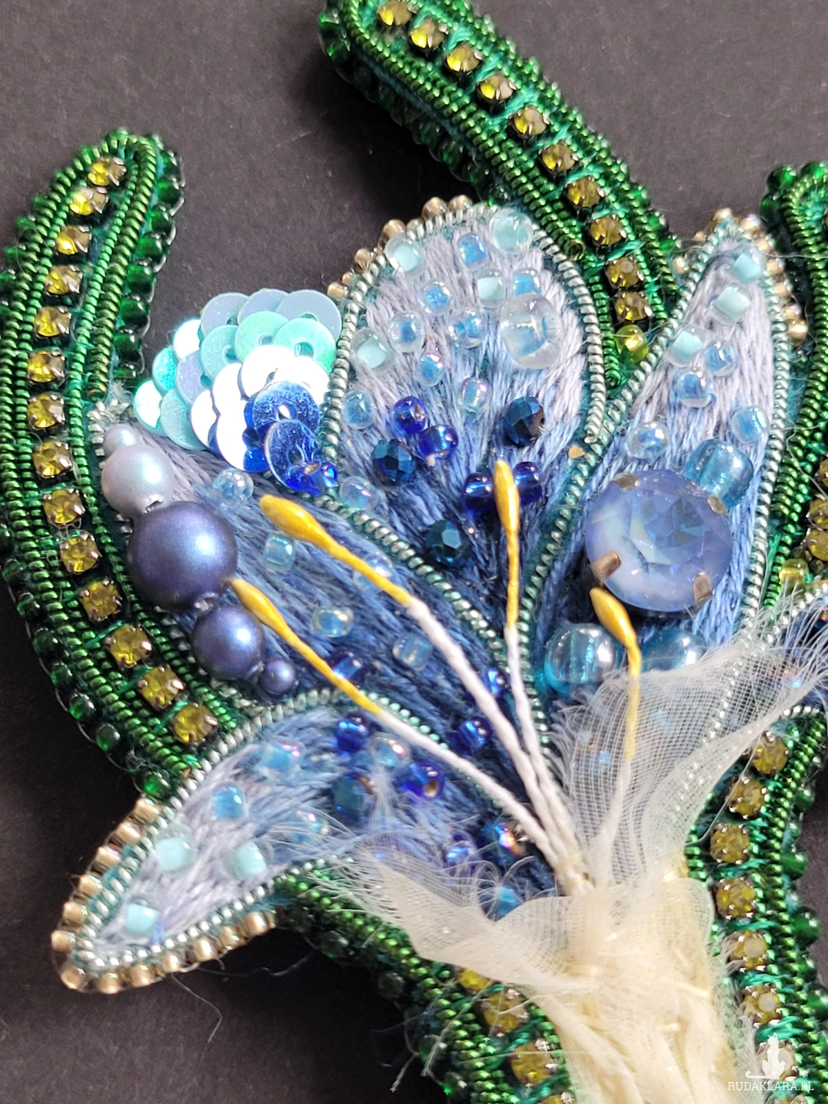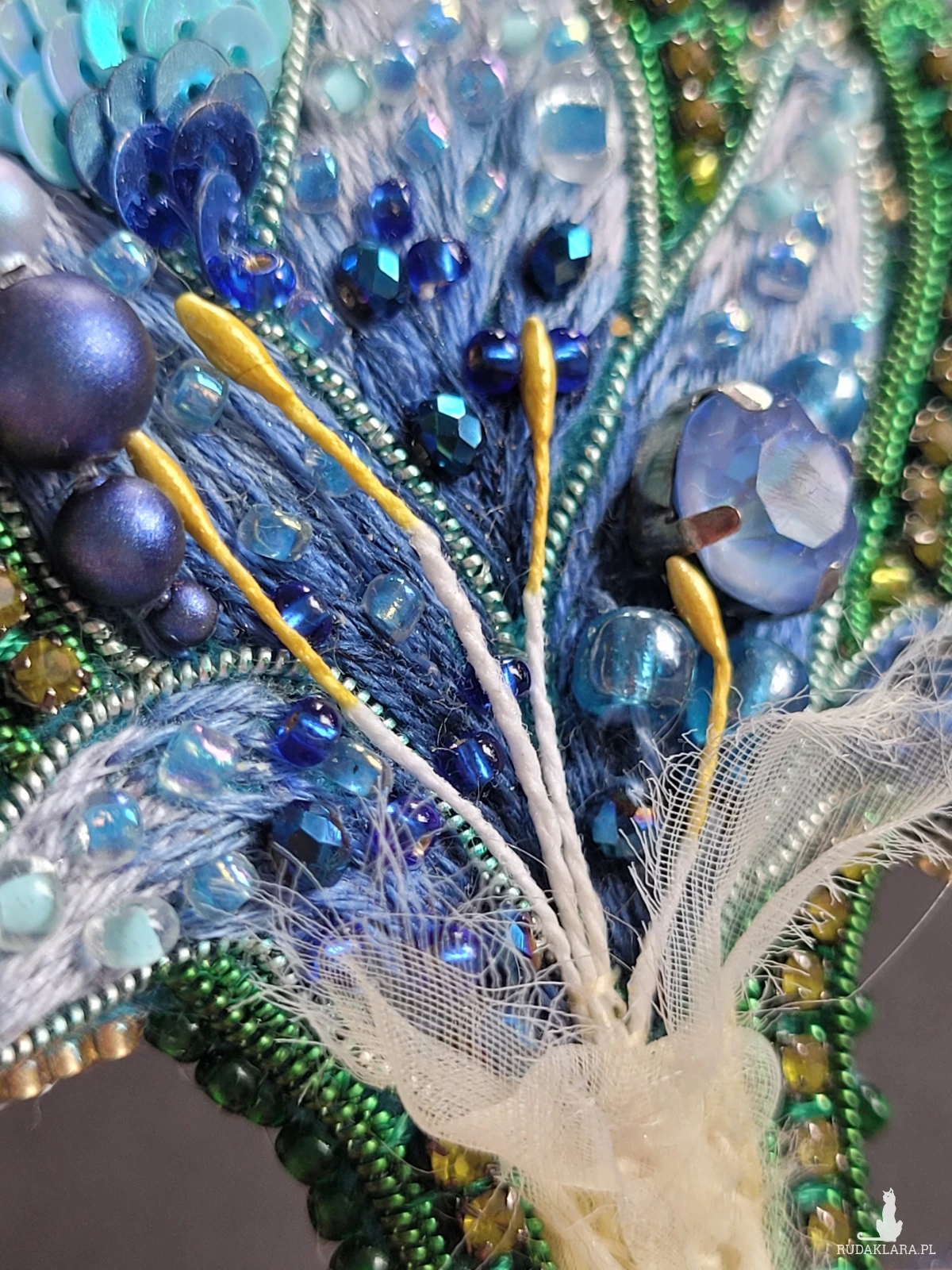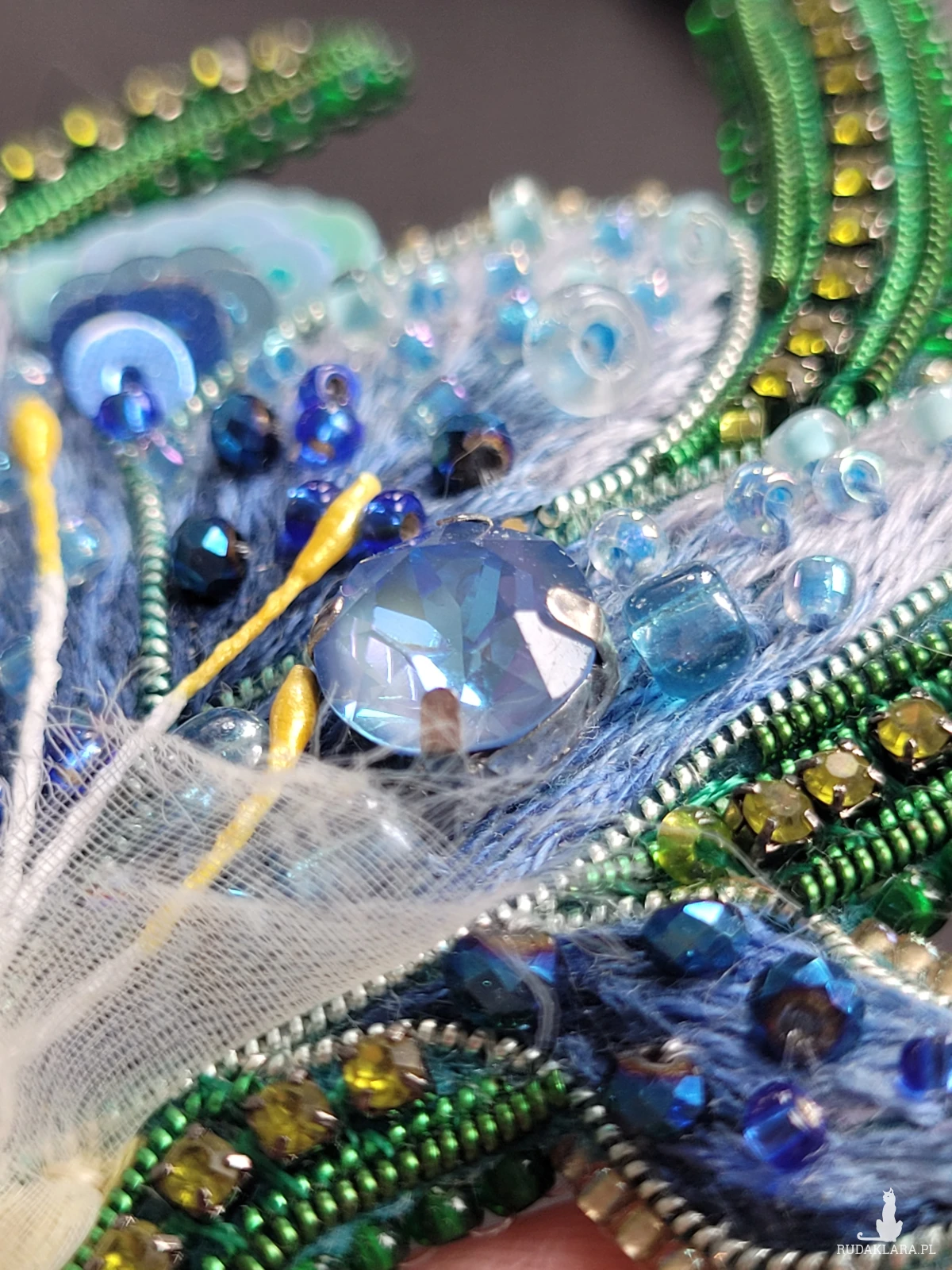 🔸 Materiały: wysokiej jakości szklane koraliki, duże połyskujące kryształy, ozdobne koraliki, tkanina szyfon, skóra ekologiczna (tył broszki).