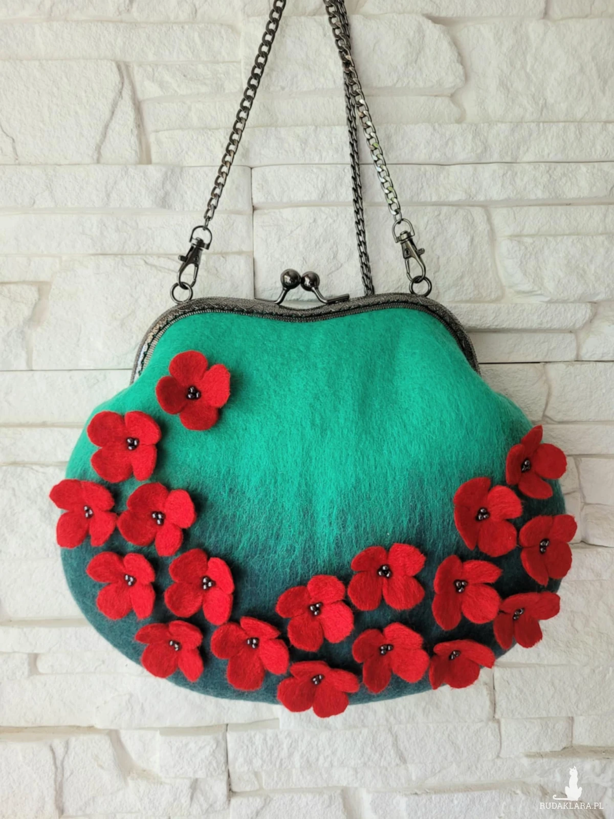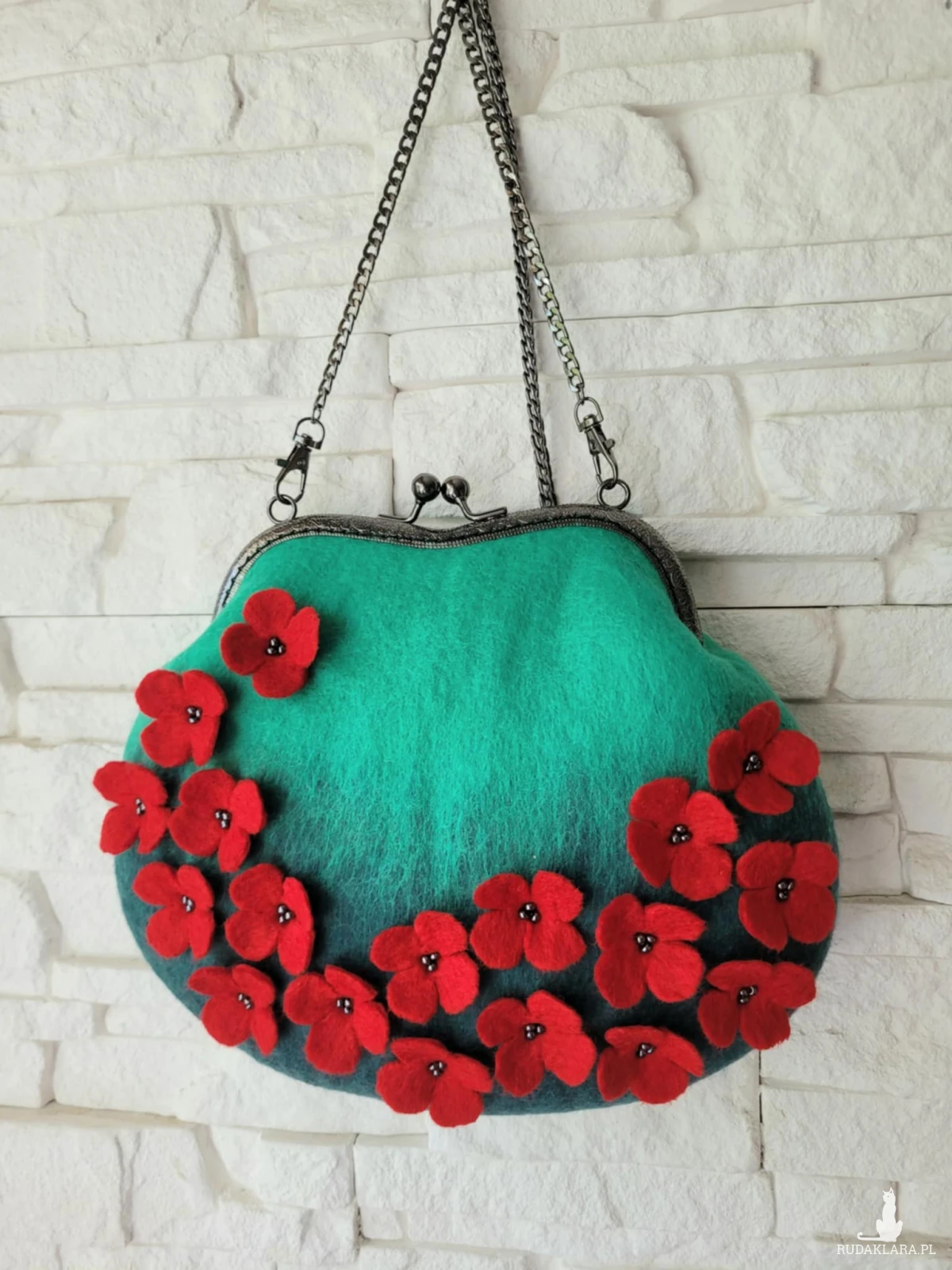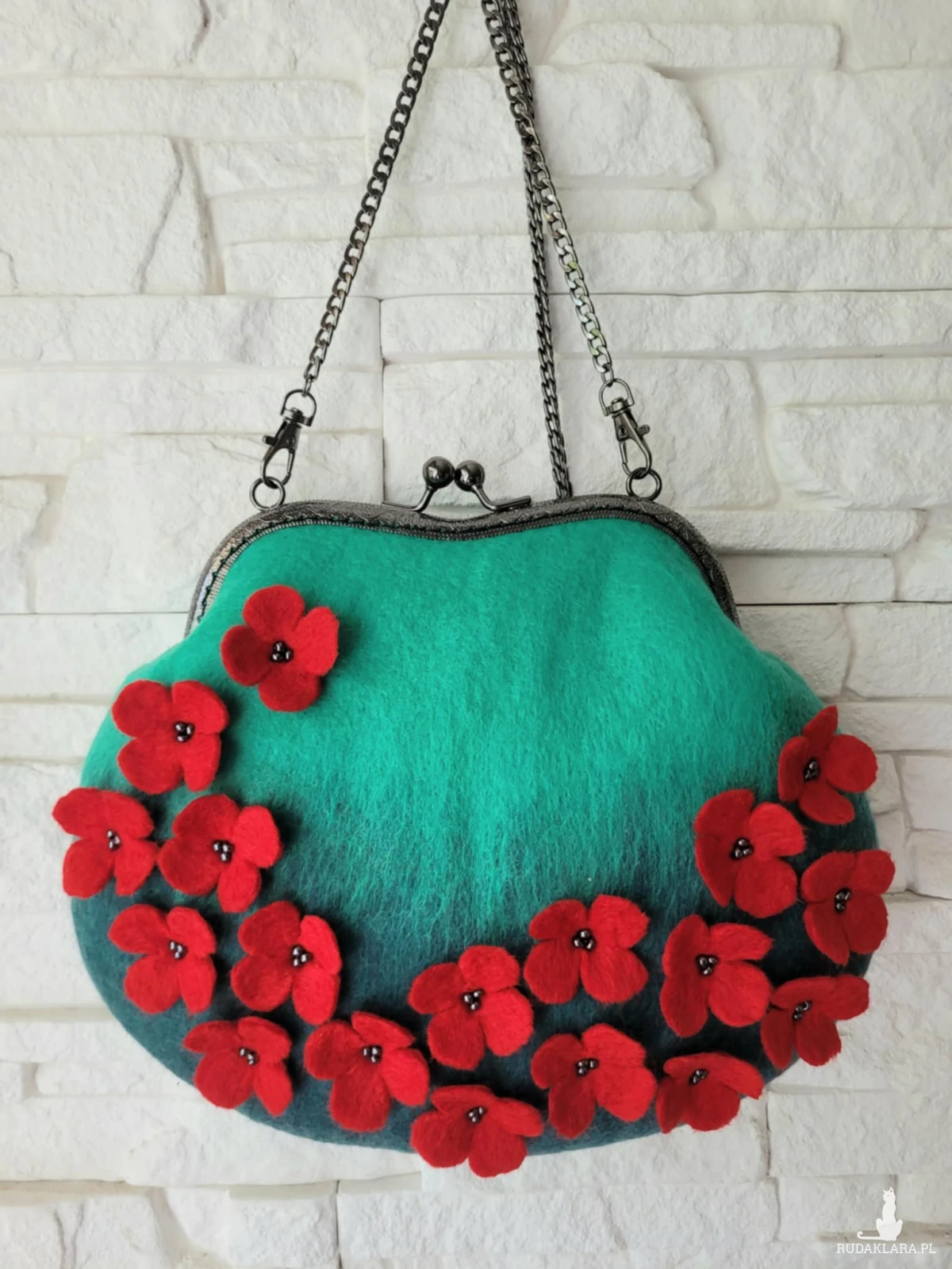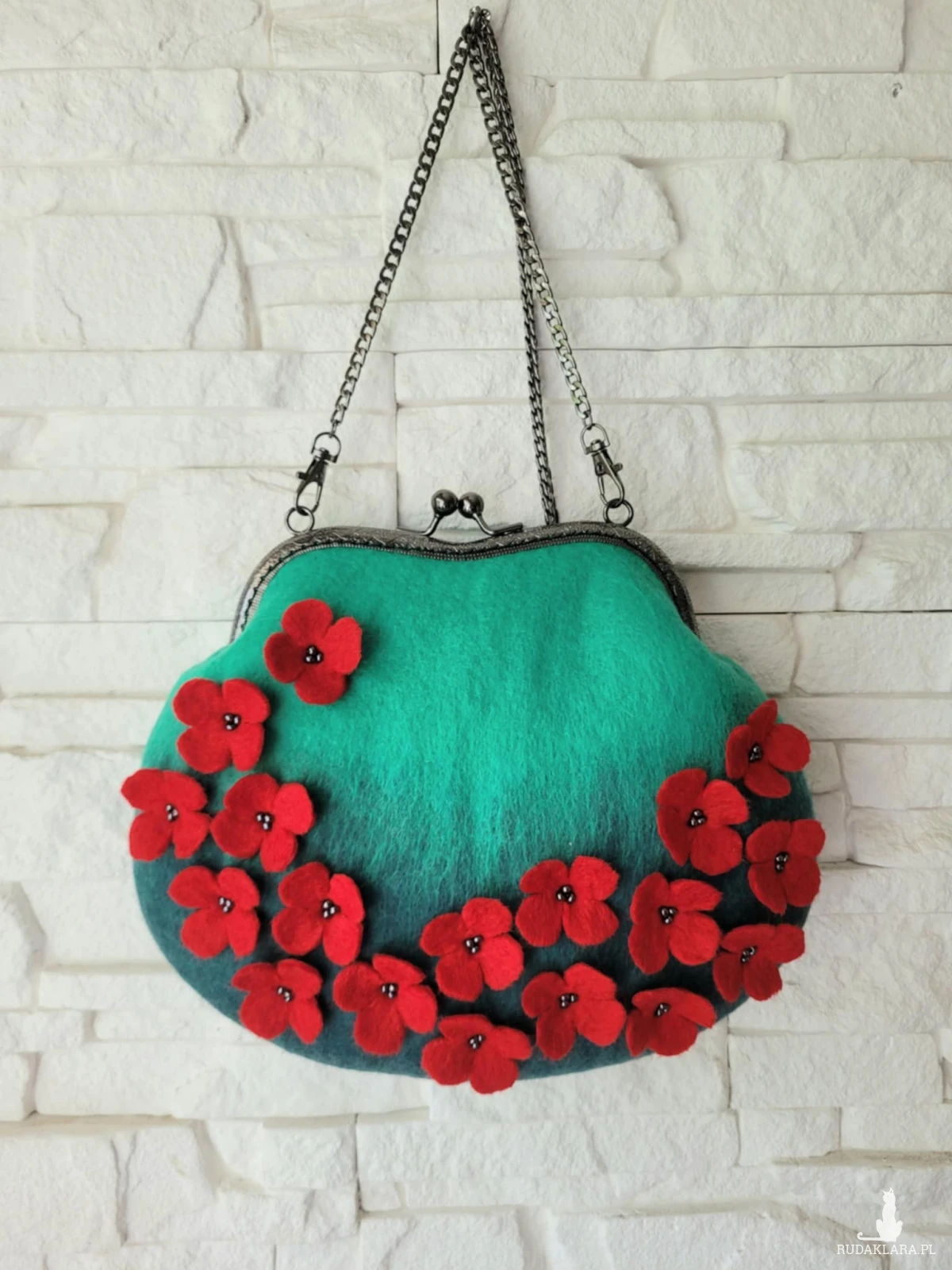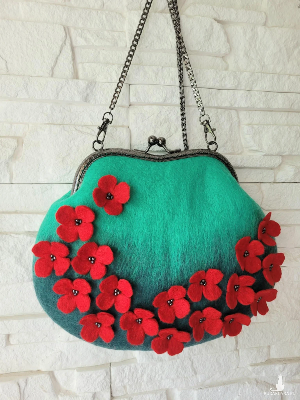 Torebka wykonana techniką filacowania na mokro z wełny merynosa australijskiego i nowozelandzkiego.