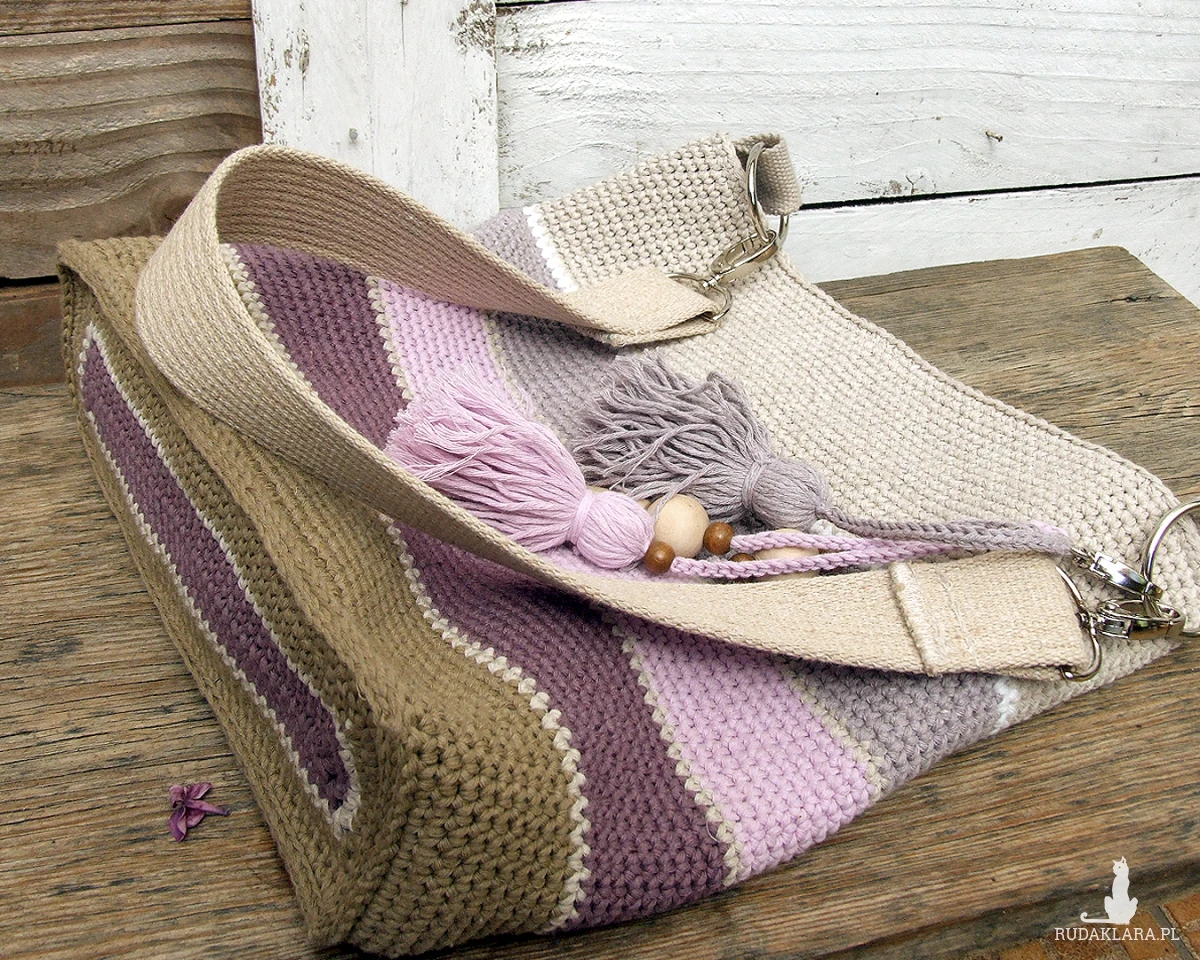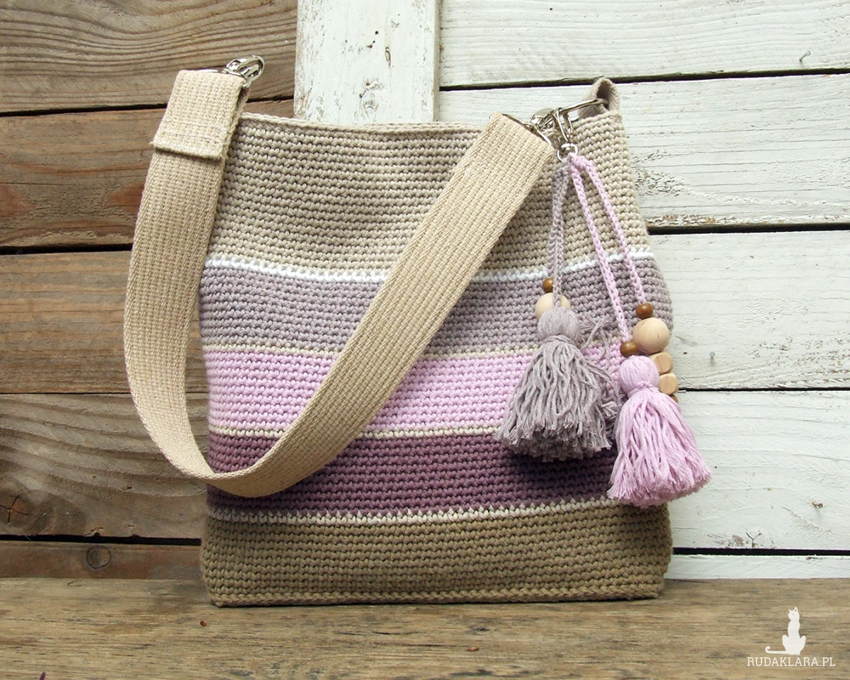 Bawełniana torebka na ramię, średniej wielkości. Wykonana na szydełku z bawełnianej włóczki. Dodatkową ozdobą jest ręcznie wykonany brelok z dużymi chwostami i drewnianymi koralikami, brelok można odpinać.