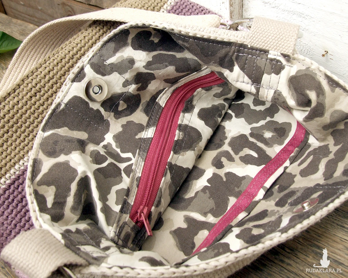 Torebka nie jest usztywniona, bez wypełnienia/zawartości jest płaska, jedynie dno wzmocnione jest pikowaną tkaniną dzięki temu ładnie trzyma kształt. Zapinana na zapięcie magnetyczne. Środek torebki wykończony podszewką z dwiema kieszonkami, w tym jedną zapinaną na zamek błyskawiczny.