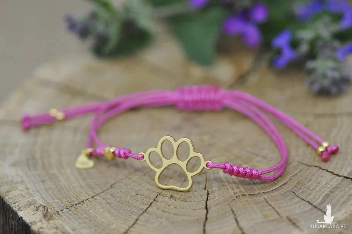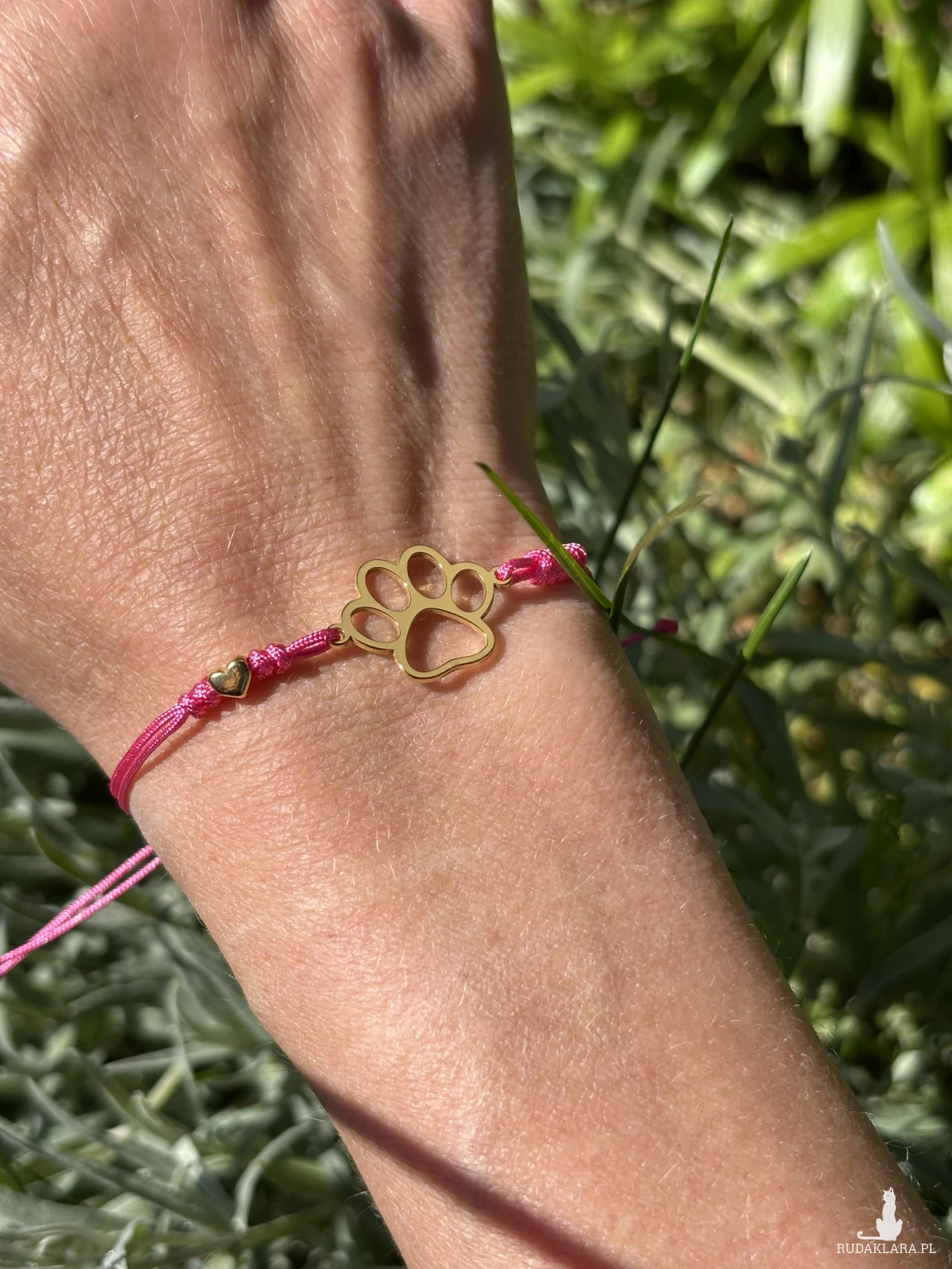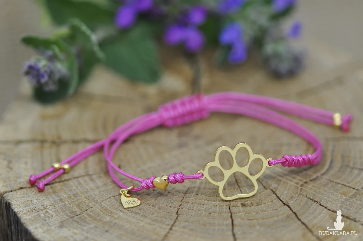 Łapa ze srebrnej blachy próby 925, o wymiarach 14,8 x 21,6 mm, grubość 0,8 mm, srebrne kulki na zakończeniach sznurka oraz koralik serduszko.