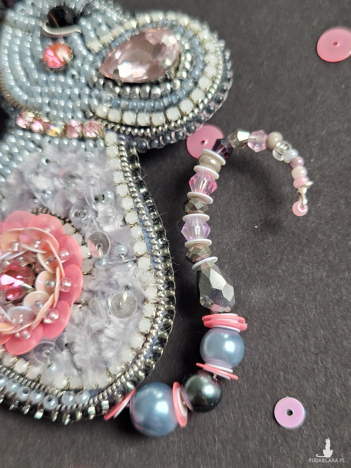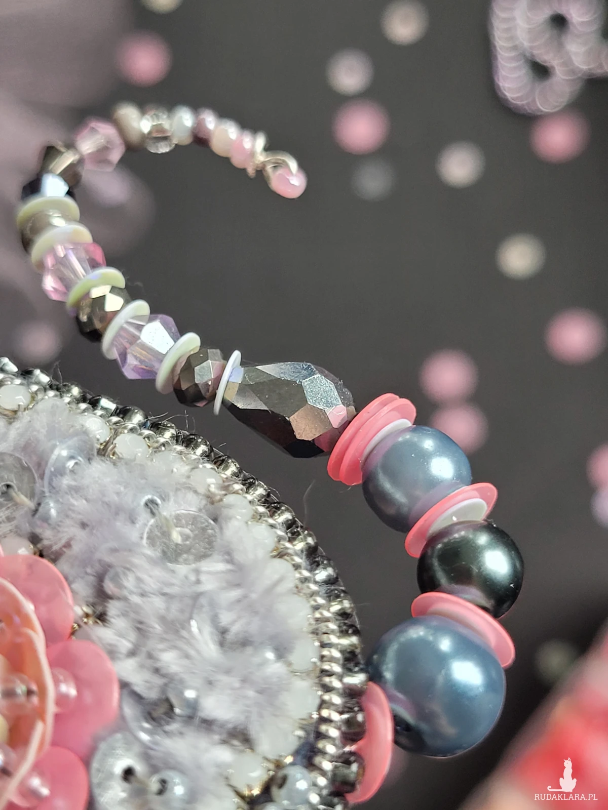Ręczne wykonanie z koralików, cekinów, kryształków, tkaniny i ozdobnych perełek.