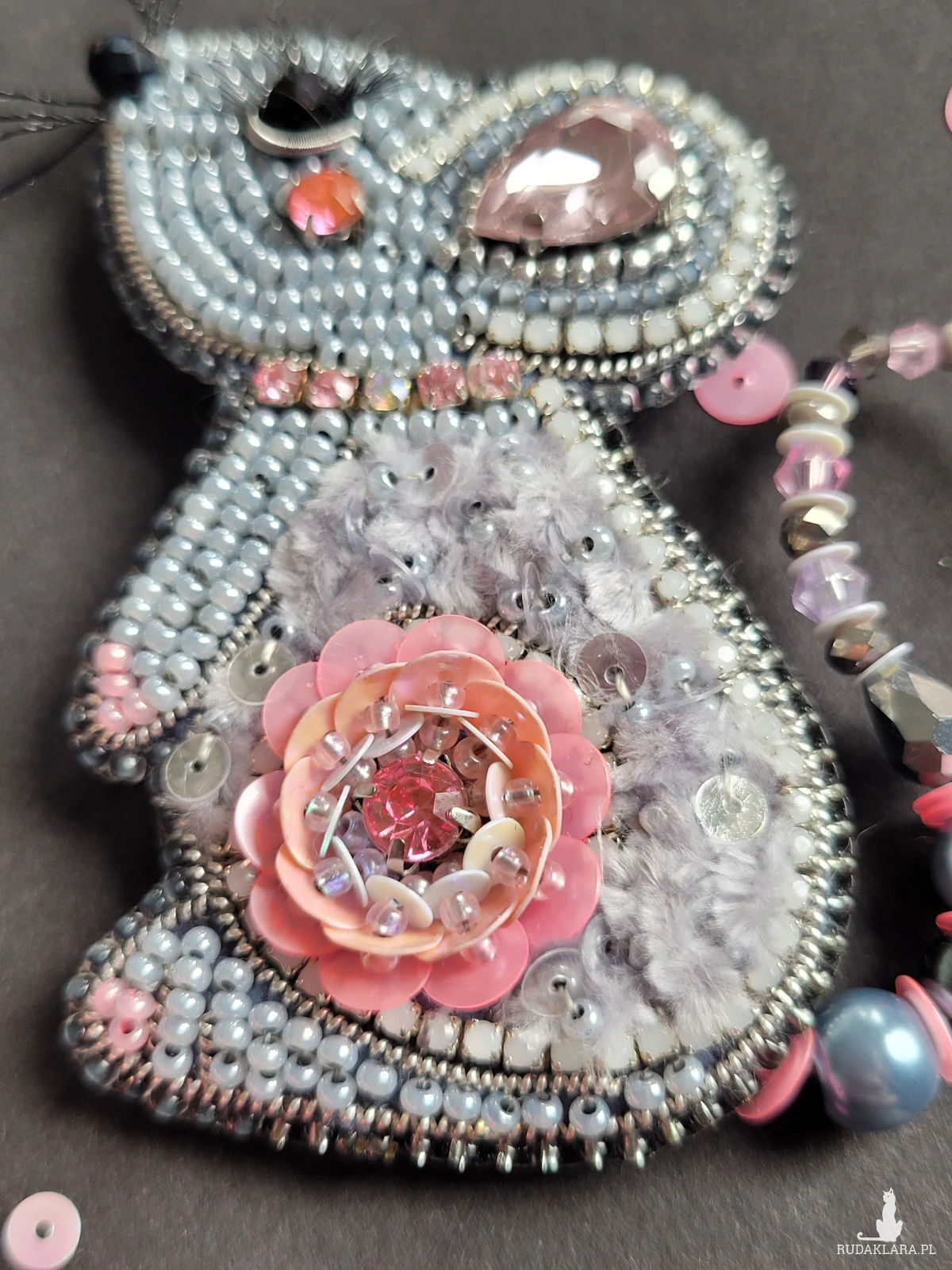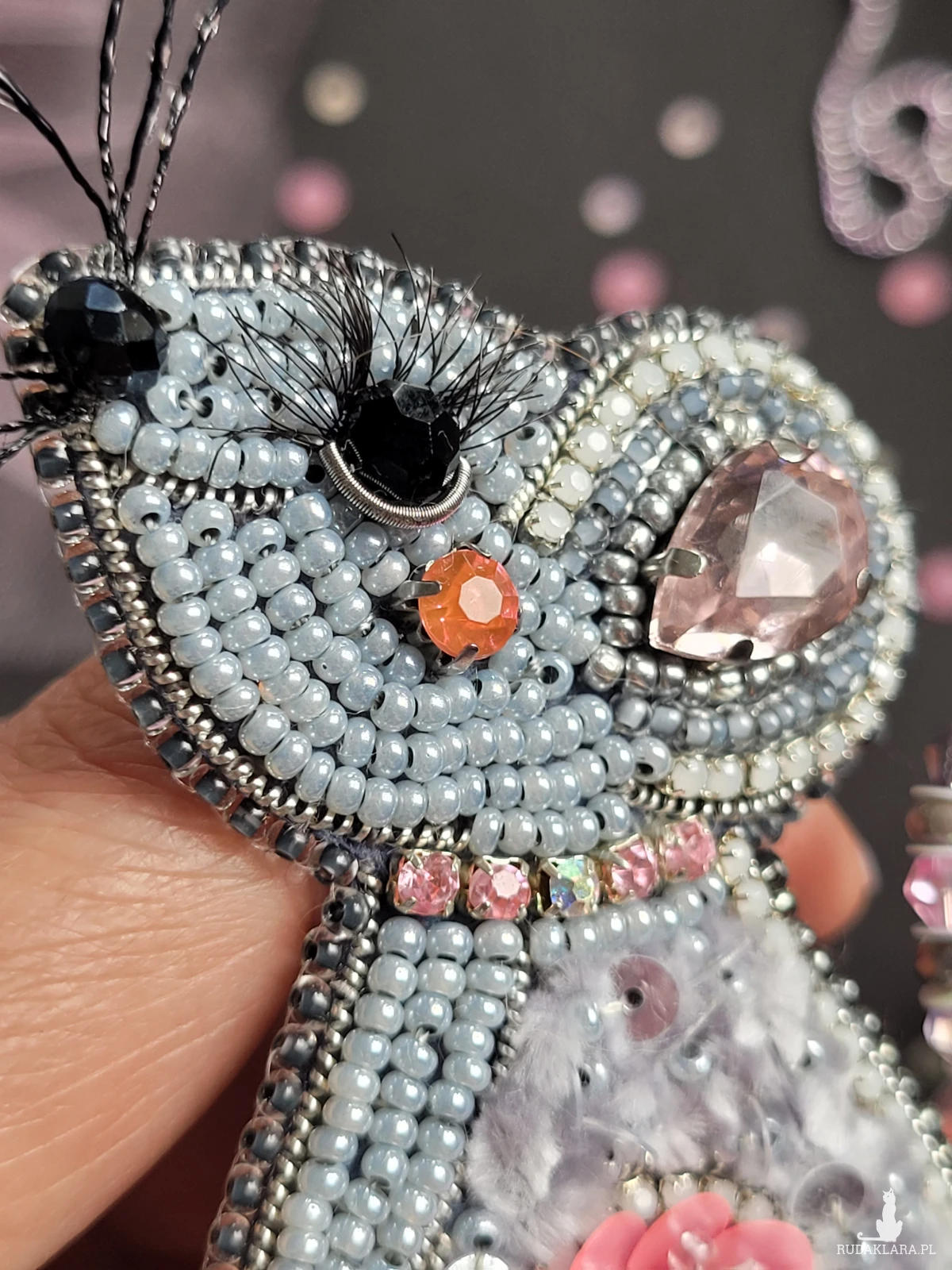 Broszka w kształcie słodkiej myszki z dużymi oczami i błyszczącymi elementami.