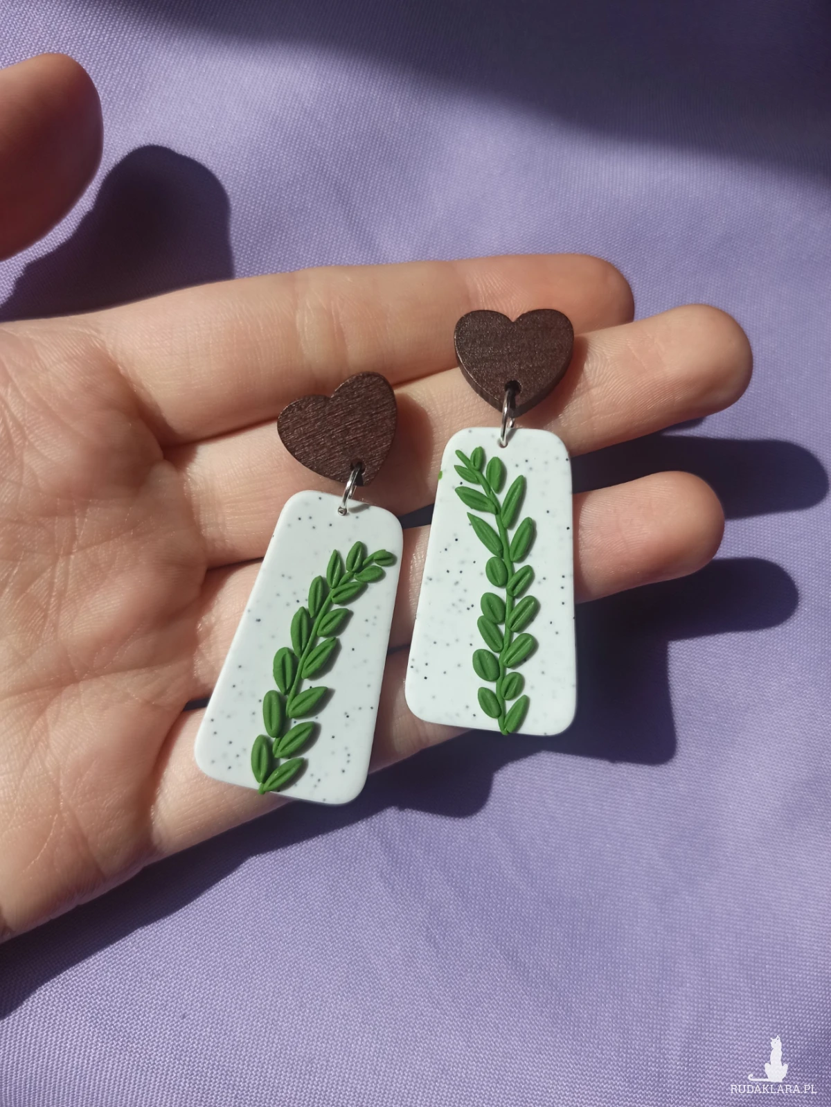 Kolczyki wiszące na ozdobnym drewnianym sztyfcie serduszku. Kształt dużego trapezu w kolorze nakrapianej bieli z zieloną gałązką.