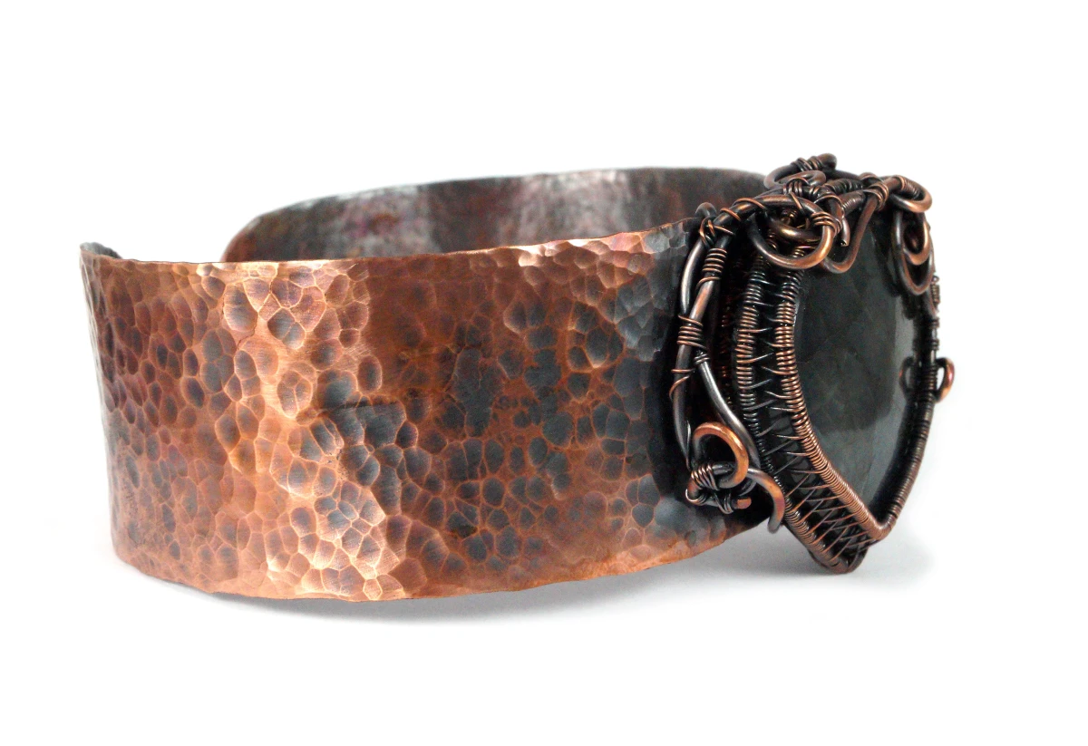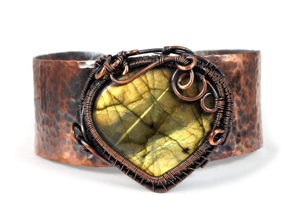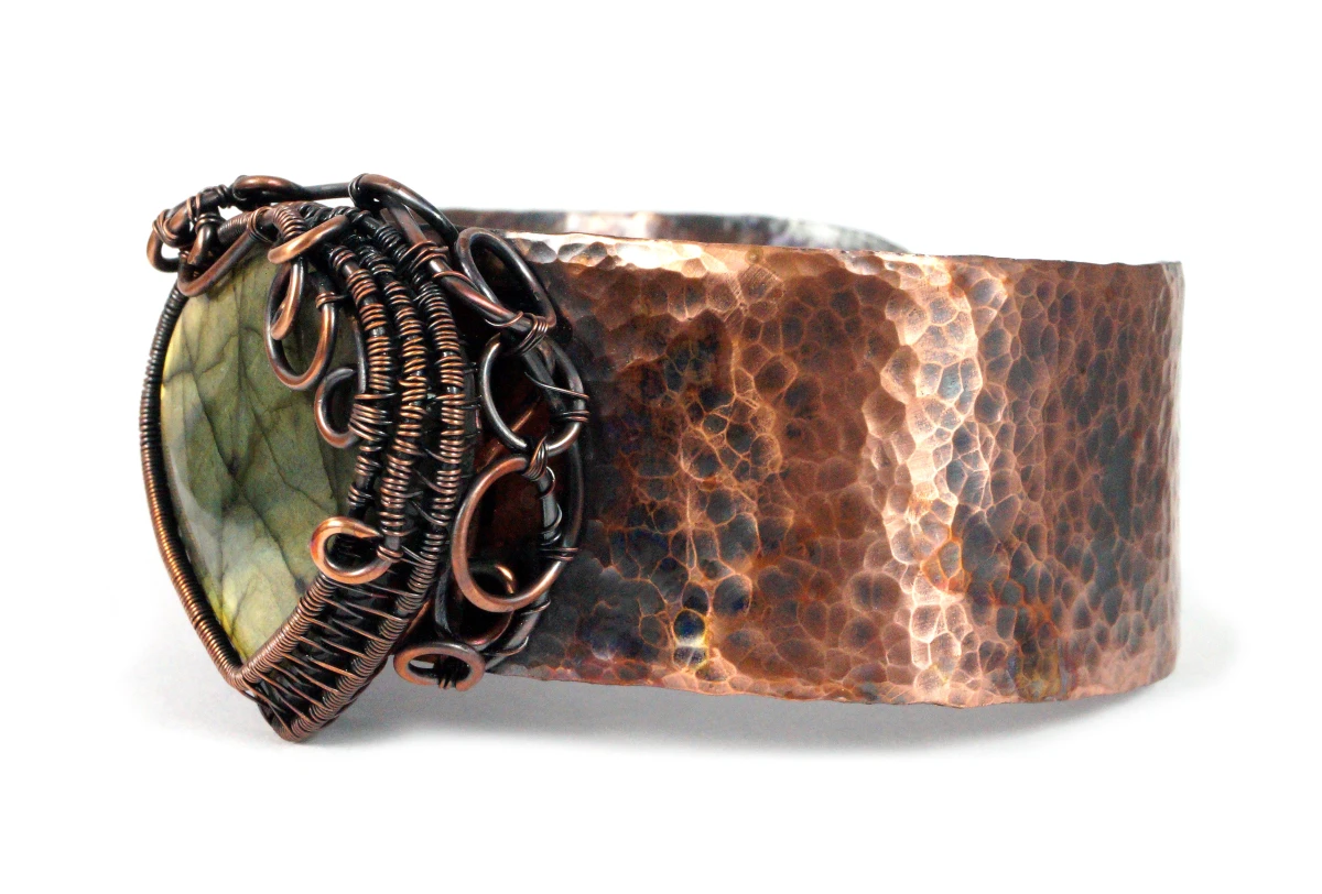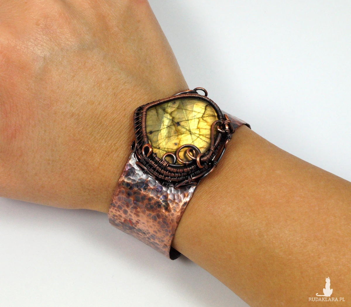 Bajeczna, misternie wykonana bransoletka z patynowanej miedzi z kaboszonem labradorytu w żółtym kolorze. Bransoletka wykonana z młotkowanej miedzi i z kaboszonu labradorytu osadzonego w technice wire wrapping. Bransoletka regulowana. Miedz młotkowana, patynowana polerowana i przecierana.