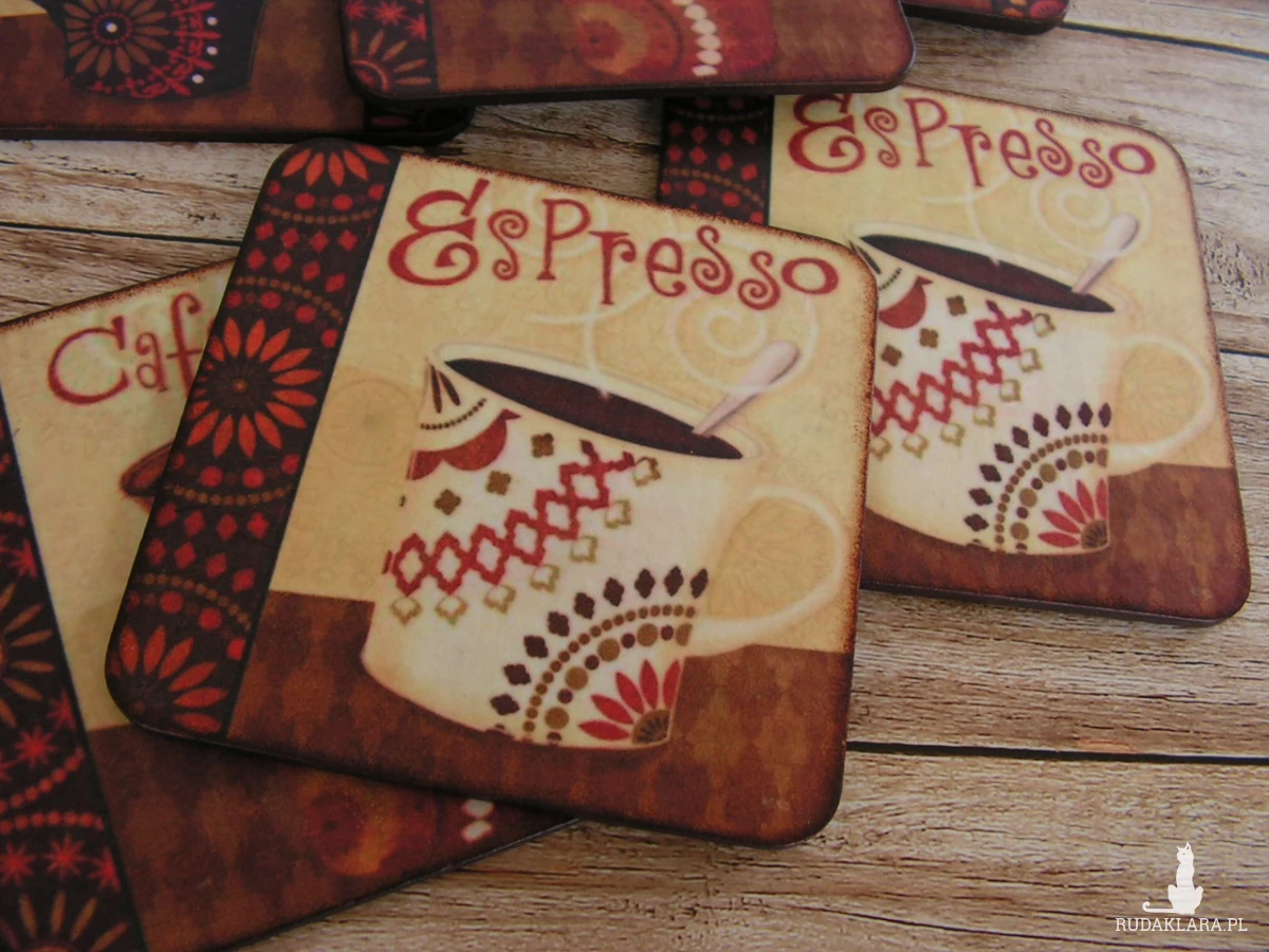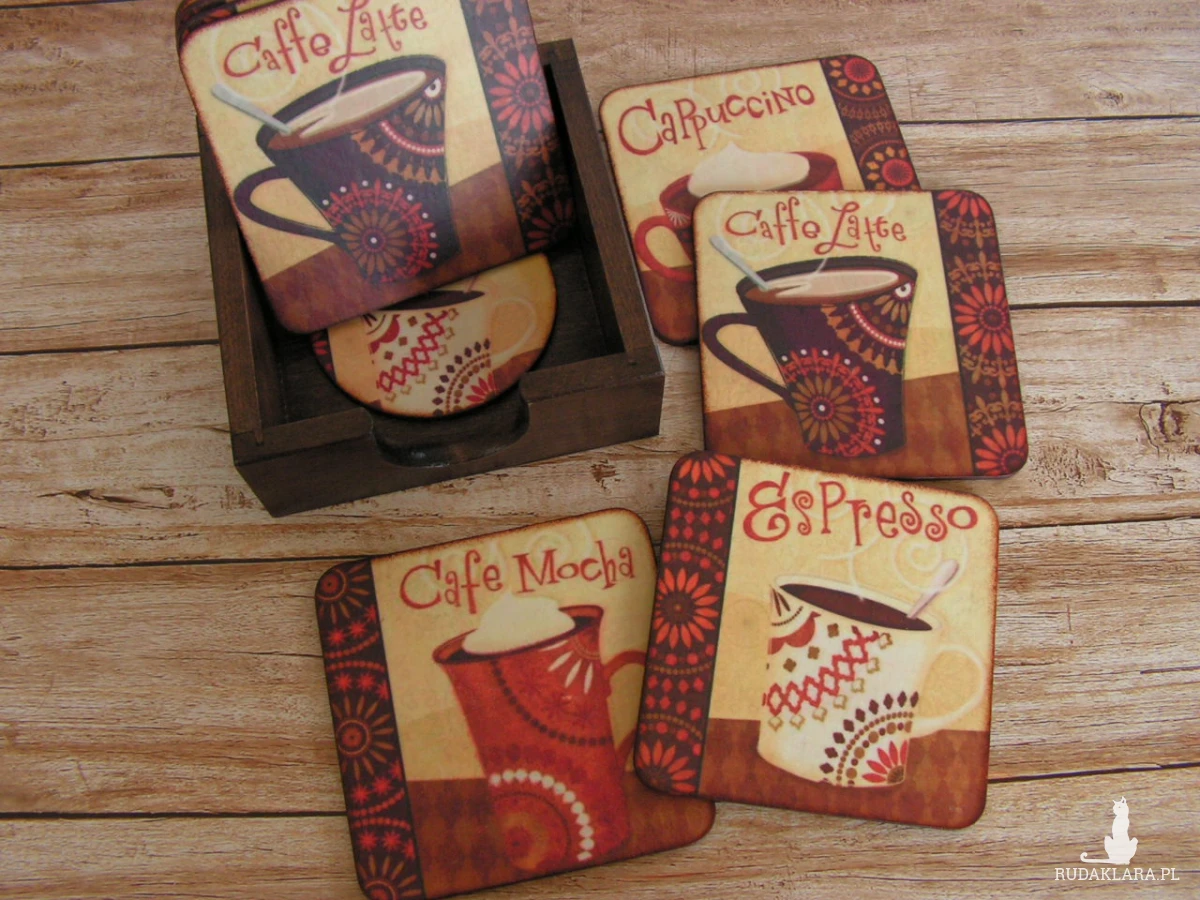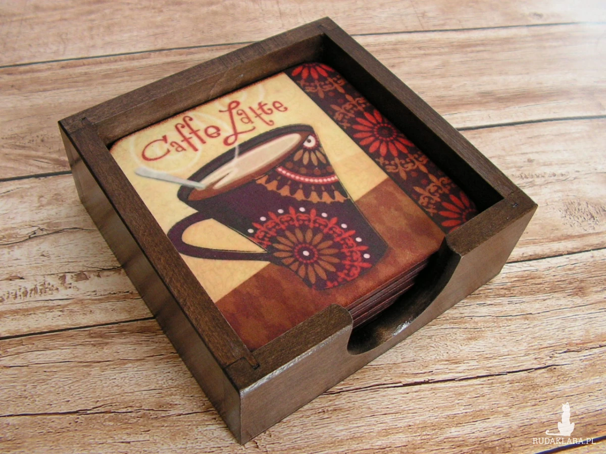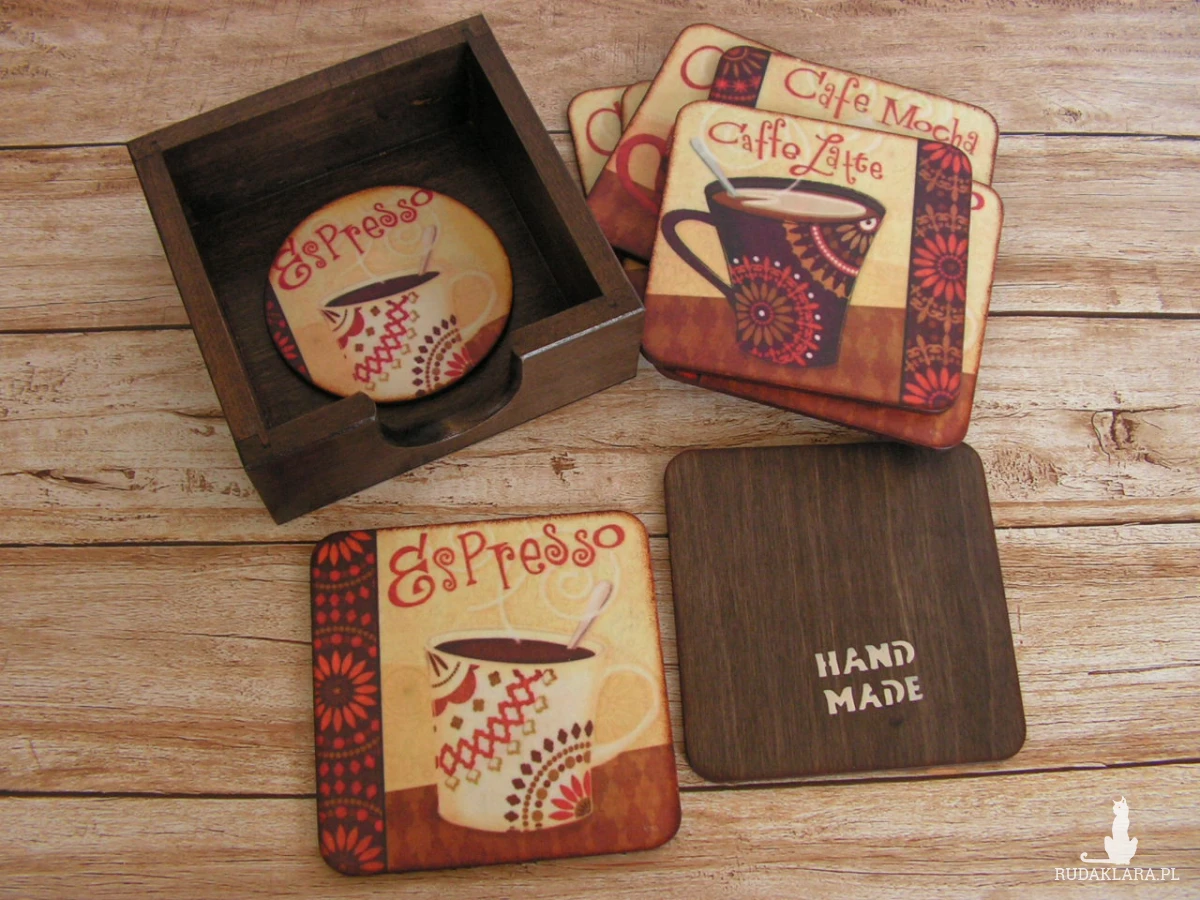 Podkładki i pudełko pomalowane bejcą wodną w kolorze "belgijska czekolada" i ozdobione techniką decoupage.