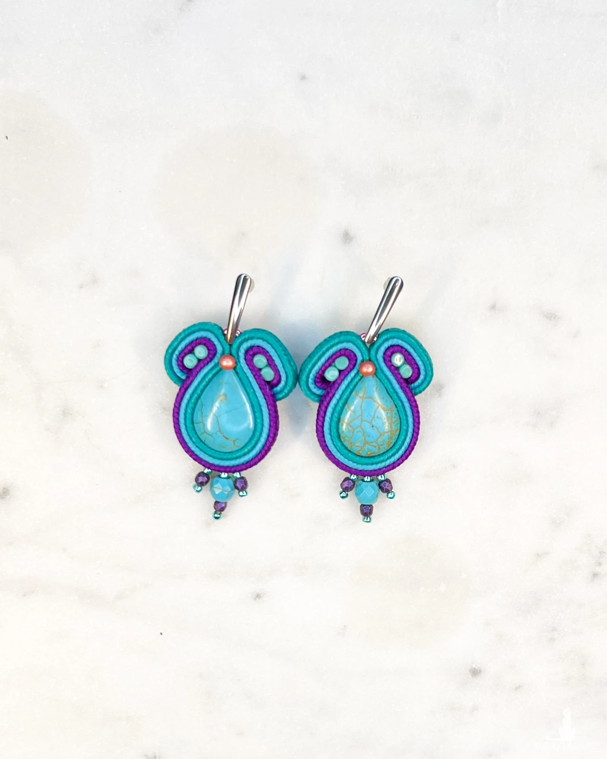 Średnie, leciutkie kolczyki z turkusowym howlitem i ozdobą z małych koralików. Intensywne kolory kolczyków ożywią każdy strój. Idealne na codzień. Kolczyki na sztyfcie ze stali chirurgicznej w kolorze srebrnym.