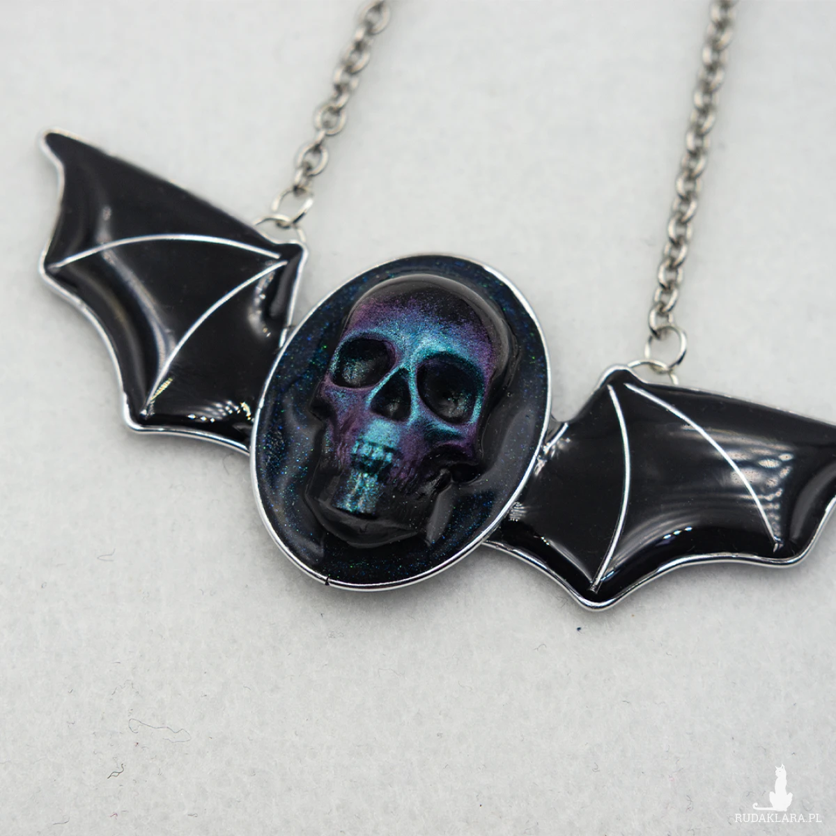 Ten piękny i oryginalny naszyjnik będzie świetnym, stylowym dodatkiem do stroju każdej Gotki. Zaprojektowałam i wykonałam go ręcznie (oprócz łańcuszka), łącznie z przygotowaniem ramek i malowaniem. Byłby to też wspaniały prezent dla każdej "baby bat". Wszystkie moje przedmioty oferuję tylko w krótkich seriach (10-20 sztuk z każdego modelu). Gwarantuje to ich unikalność. Wykonany został z żywicy epoksydowej i stali chirurgicznej.