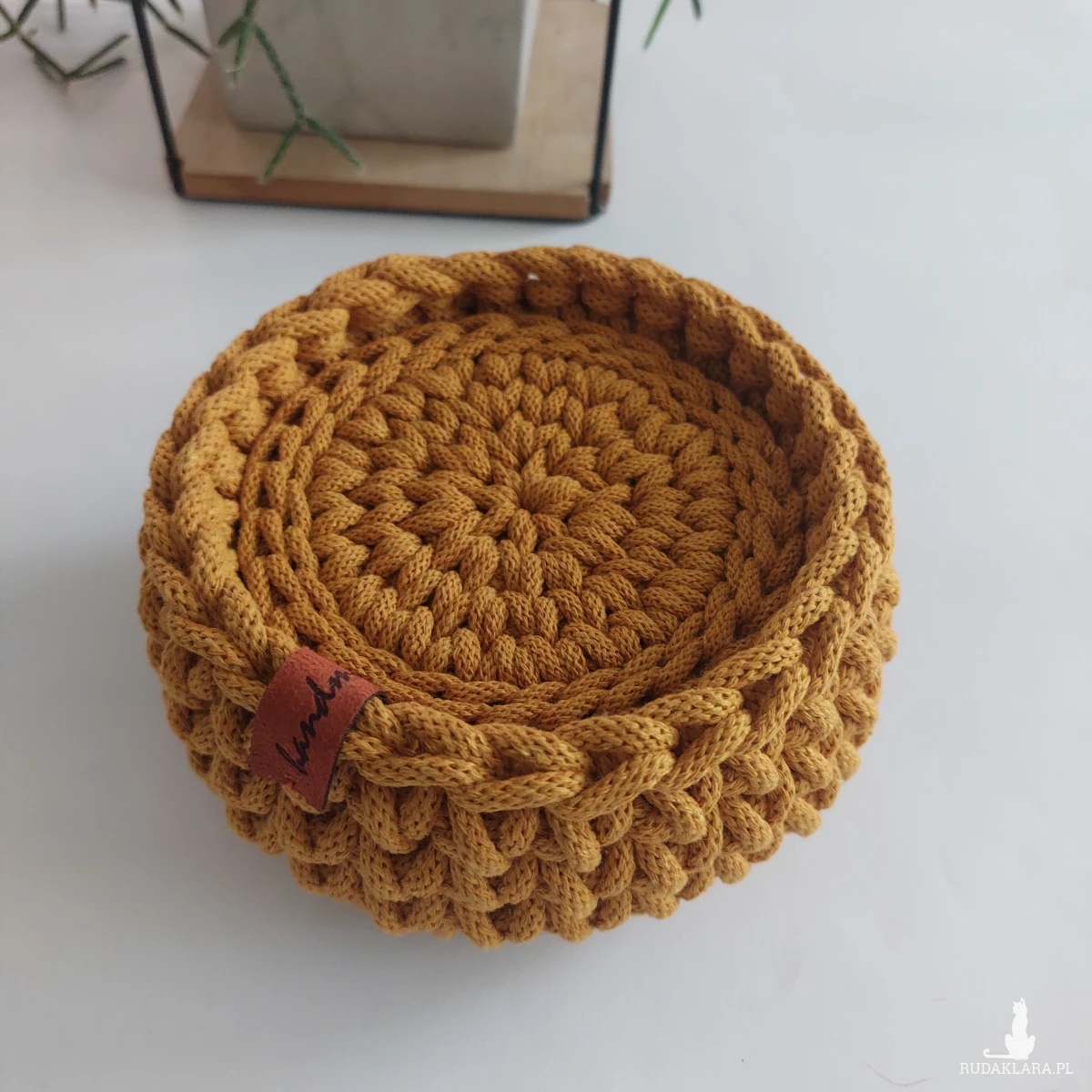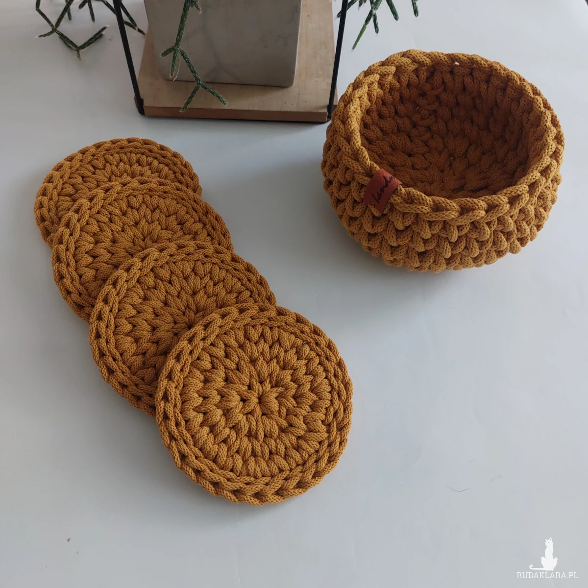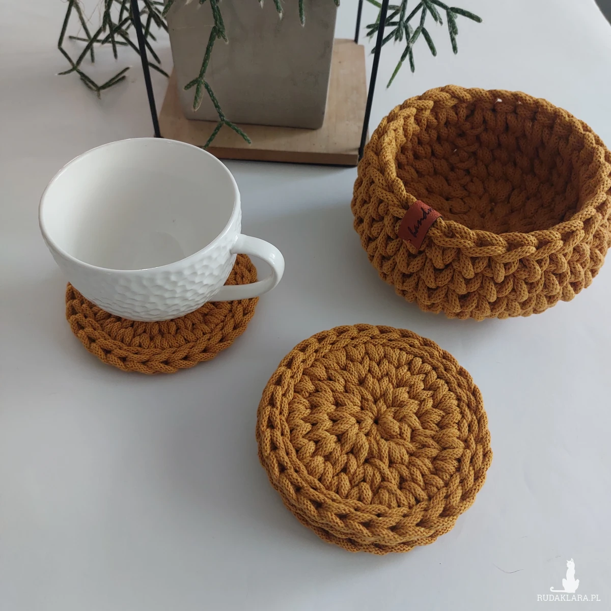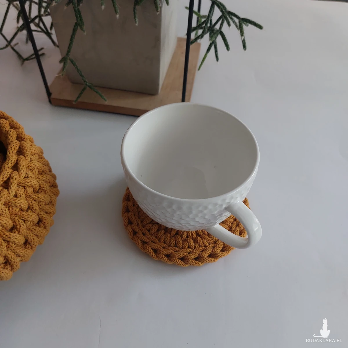 Do zaoferowania mam komplet podkładek pod kubek ( 4 szt) wykonanych ze sznurka bawełnianego o śr 3 mm w kolorze musztardowym wraz z koszyczkiem do ich przechowywania. Koszyczek wykonany jest ze sznurka bawełnianego 5 mm.