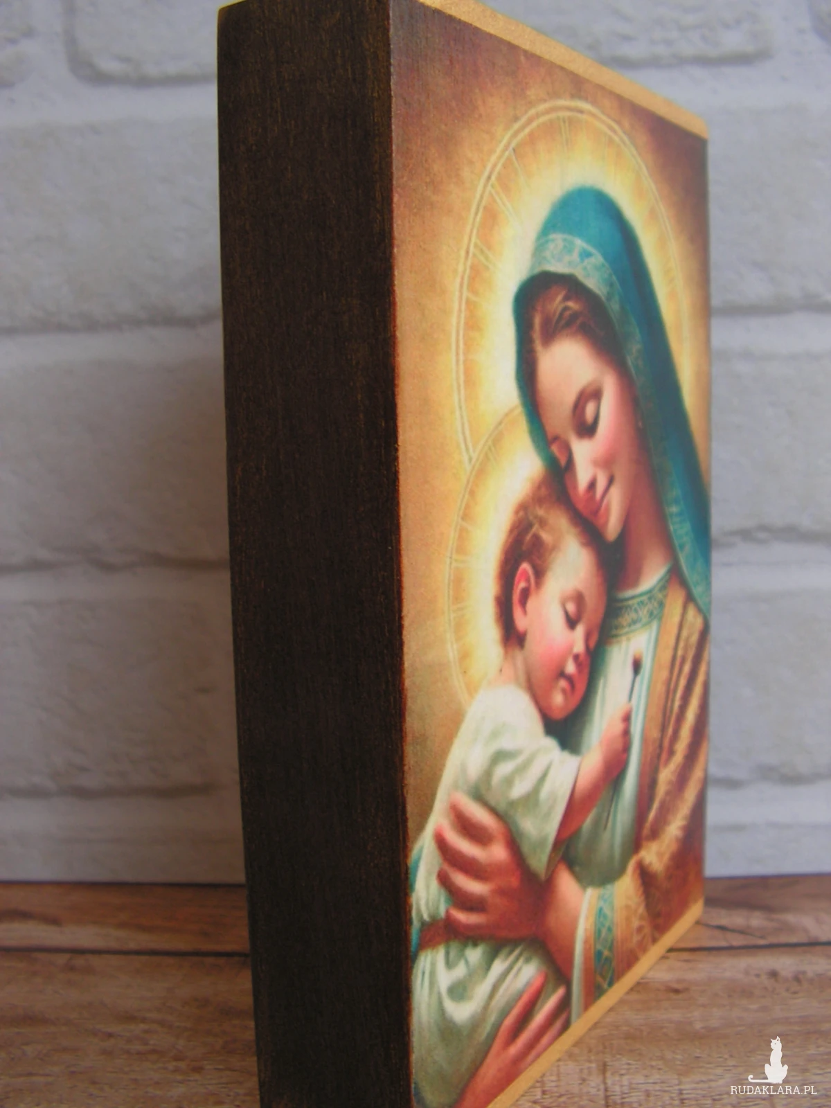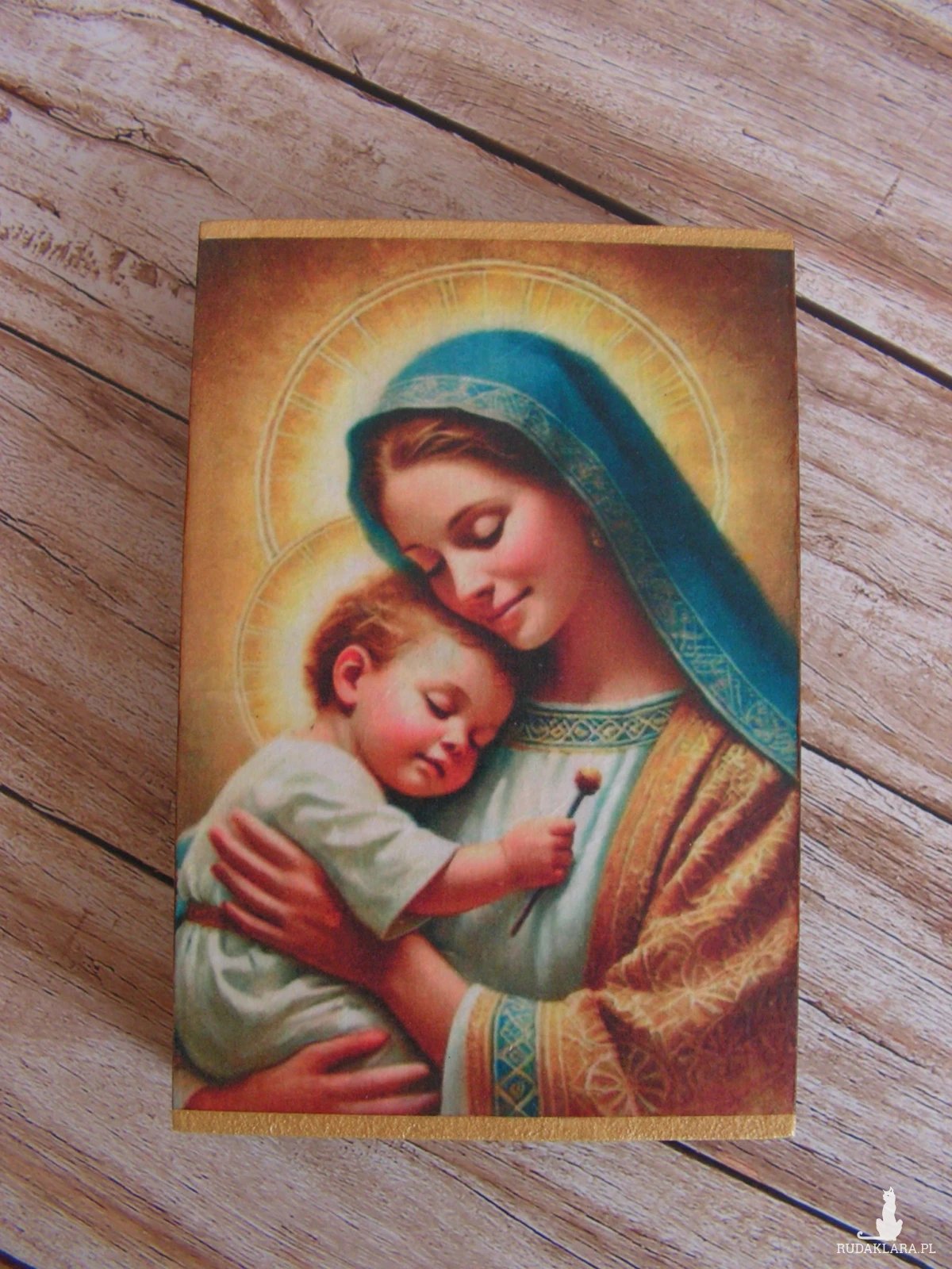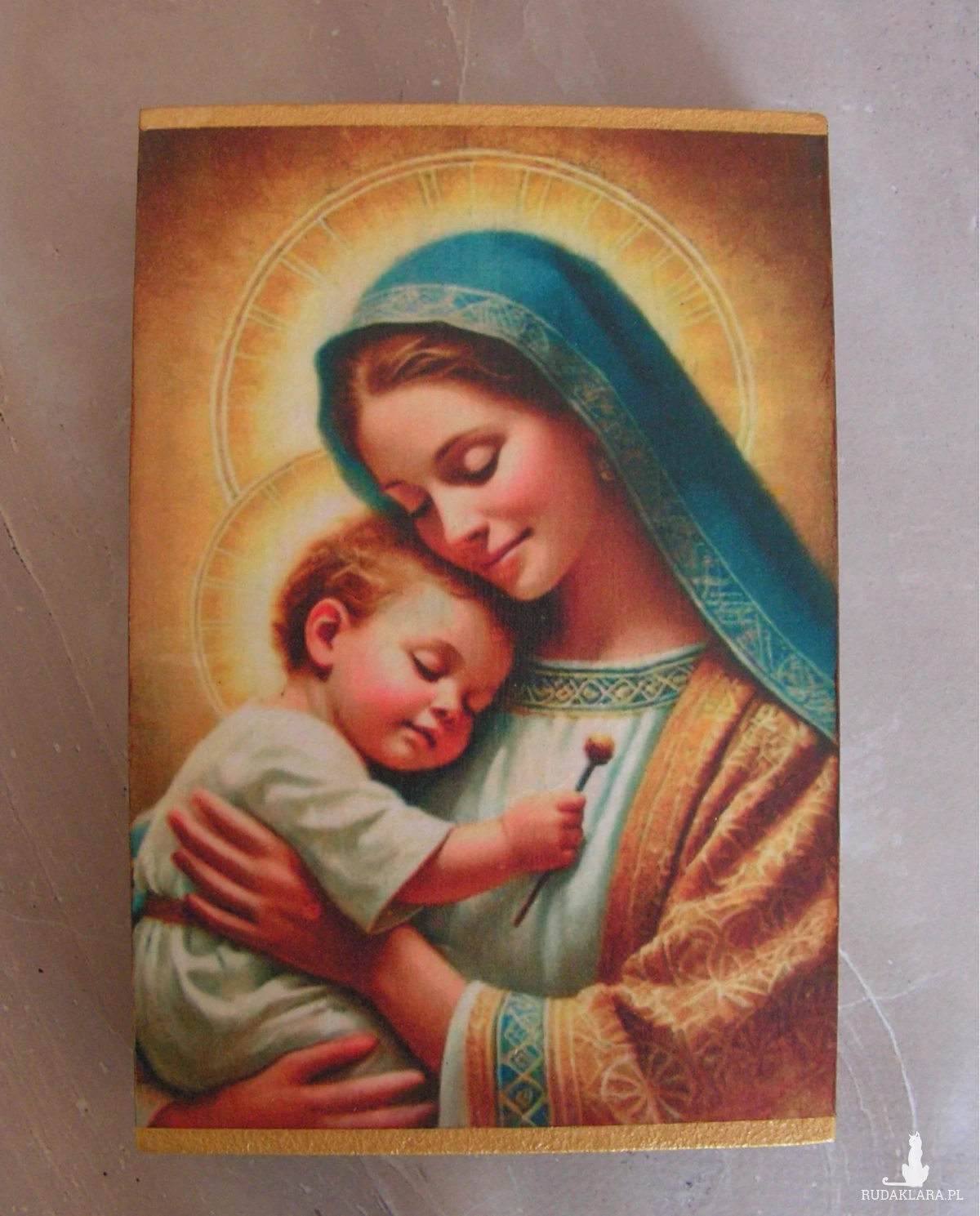 "Matka Boża Opiekunka" - obrazek na desce, wykonany w technice decoupage. Boki pomalowane bejcą wodną w kolorze „trufla” i przetarte złotą pastą antyczną.