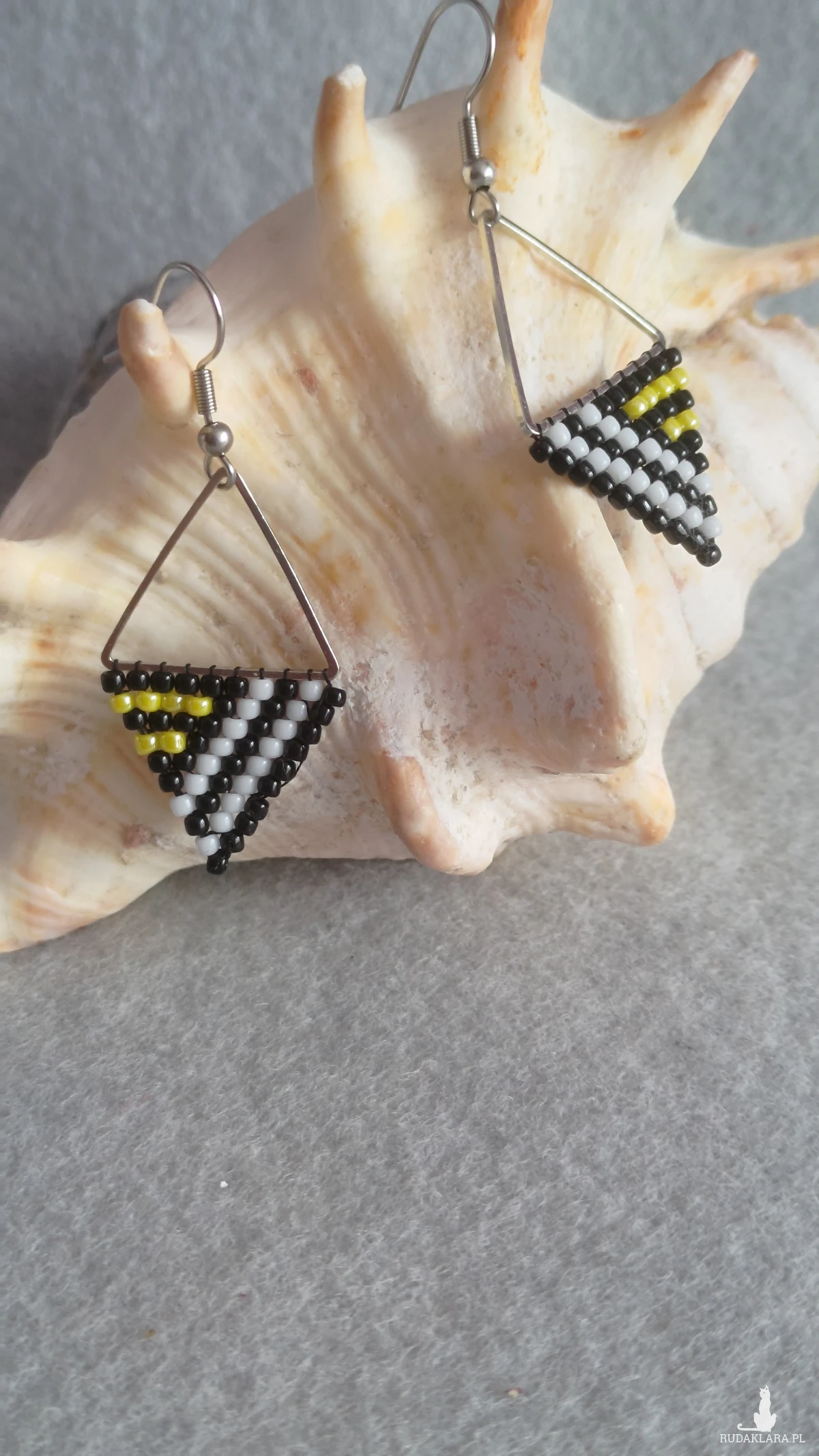 Kolczyki wykonane są z japońskich koralików toho techniką beadingu na trójkątnej bazie. Koraliki są w kolorze czarnym, białym i żółtym. Kolczyki zawieszone są na otwartych biglach ze stali chirurgicznej.