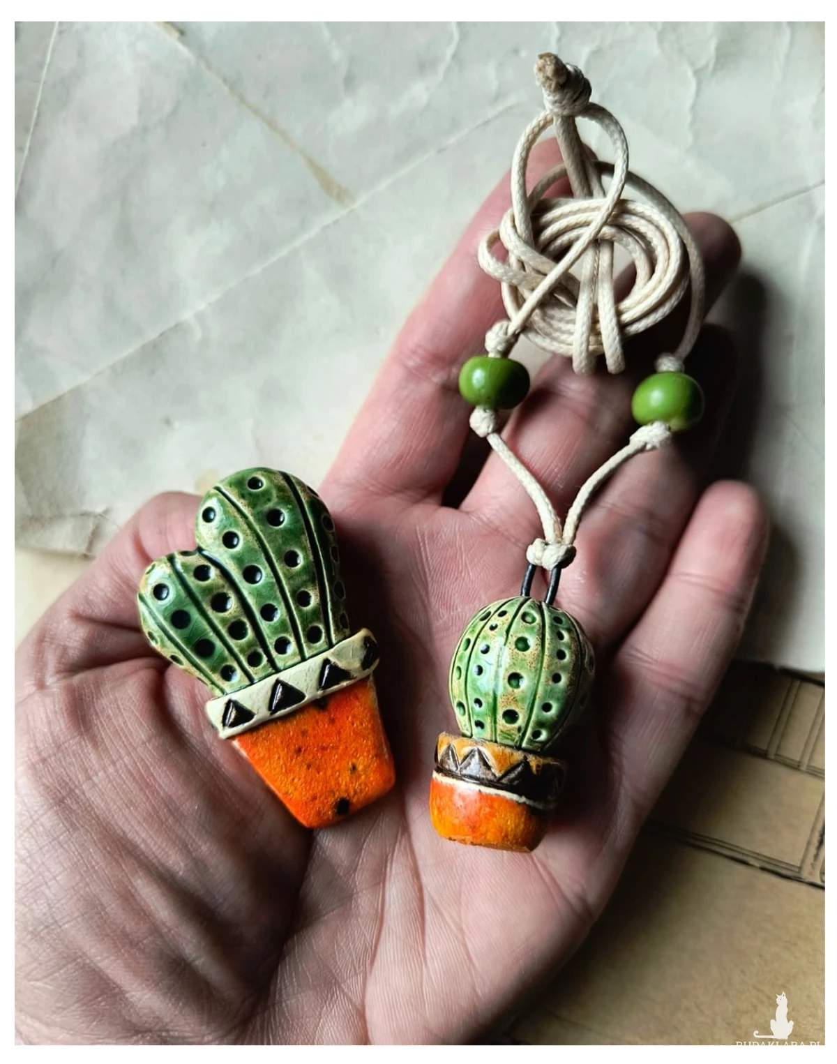 Zestaw biżuterii ceramicznej złożony z broszki kaktusa w doniczce oraz wisiorka z tym samym motywem, wykonanych z gliny szamotowej, wypalonych na biskwit, a następnie szkliwionych w temperaturze ok 1260 stopni C. O wymiarach ok; 3 cm 4,5 cm. Serdecznie polecam wszystkim Paniom poszukującym nietuzinkowej biżuterii.