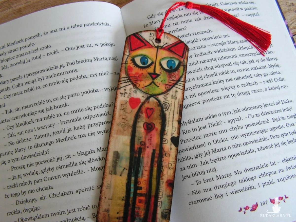 Awers - grafika na papierze ryżowym, rewers - wzór naniesiony pastą strukturalną. Wykończenie zakładki to czerwony, jedwabny chwost.