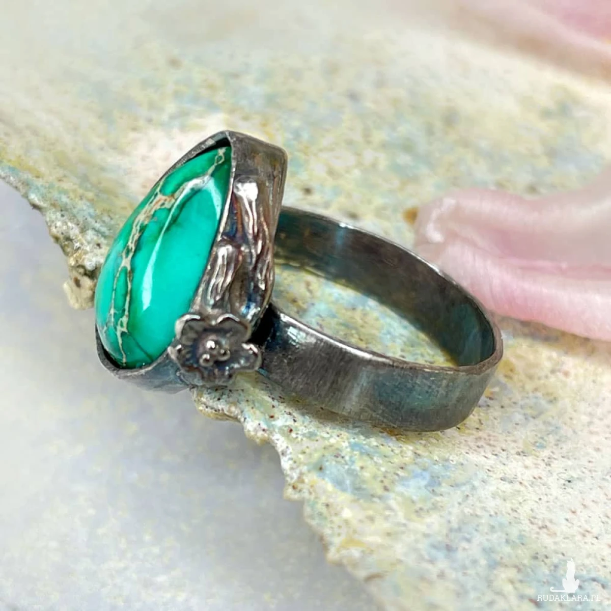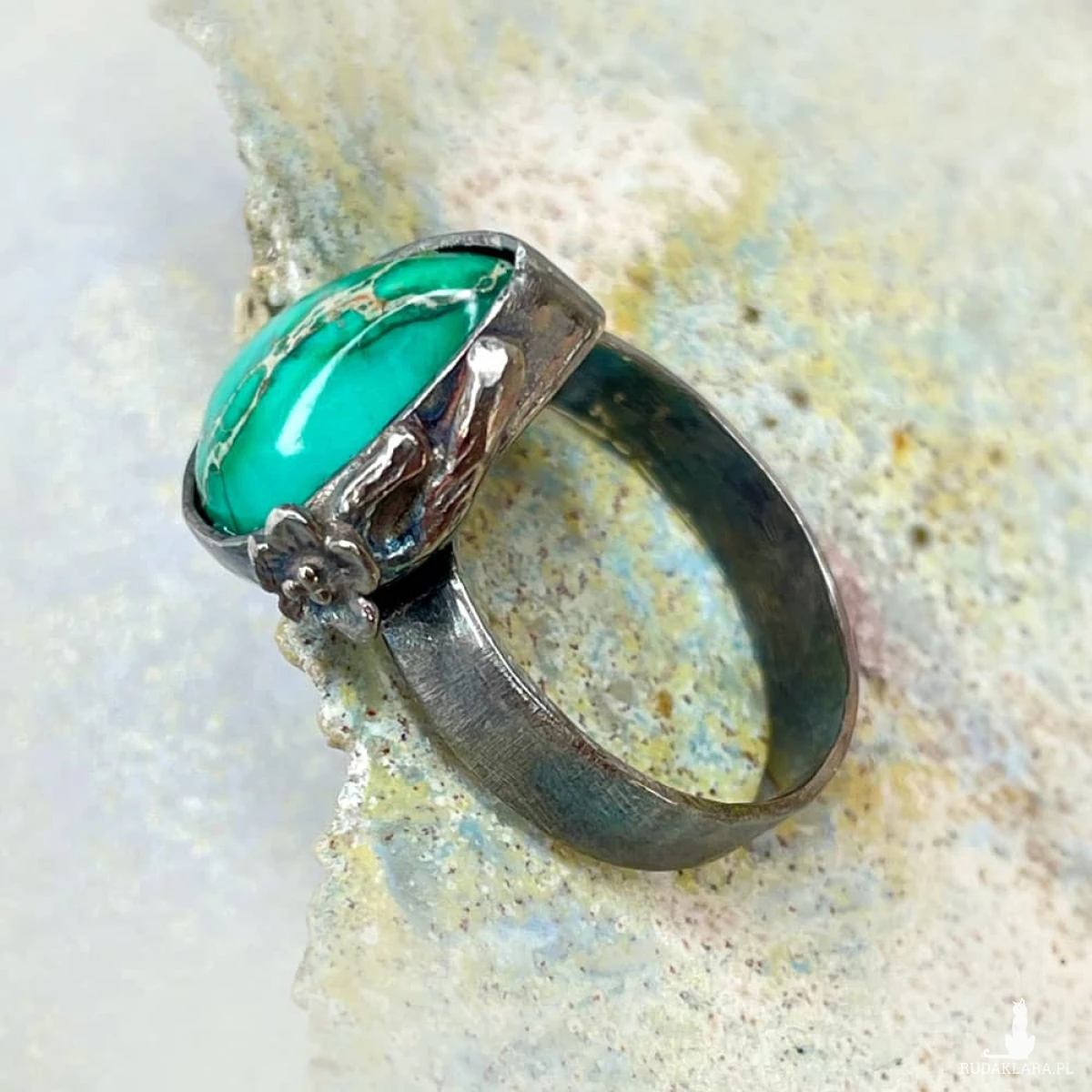 Ten srebrny pierścionek z jaspisem cesarskim to połączenie wyrazistego koloru i subtelnej formy, inspirowanej naturą. Intensywnie turkusowy kamień o charakterystycznym wzorze przywołuje na myśl mapy nieznanych miejsc – dodając biżuterii nuty tajemnicy i świeżości. Osadzony w ręcznie fakturowanym srebrze i ozdobiony kwiatowym akcentem, pierścionek zachwyca lekkością i dopracowaniem detali.