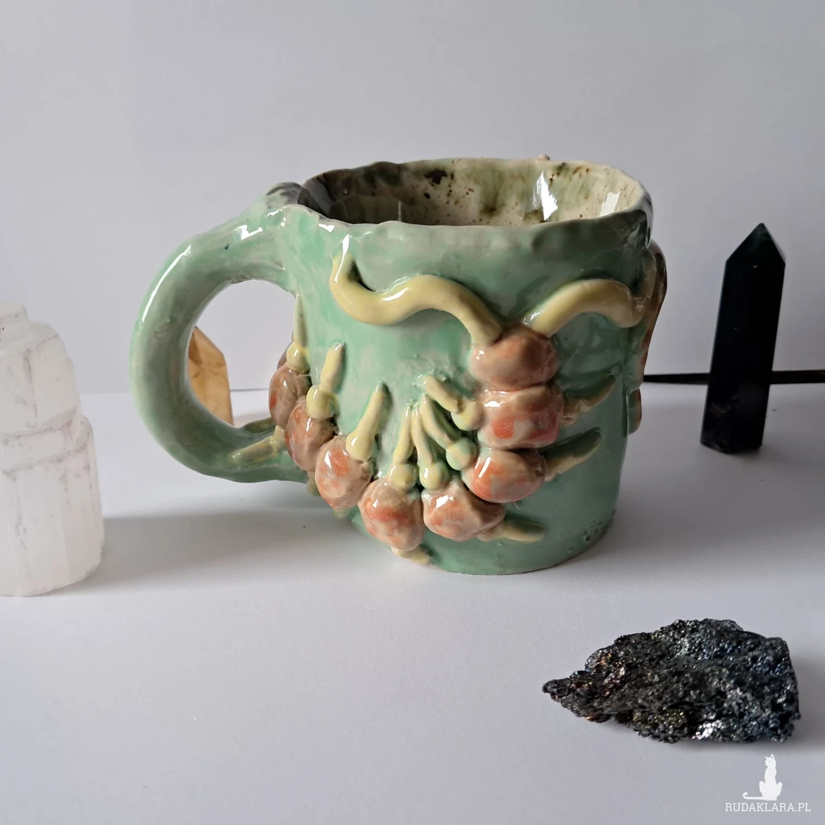 średni kubek z gliny ze skolopendrą. Wykonany własnoręcznie. Kubek ma około 170ml