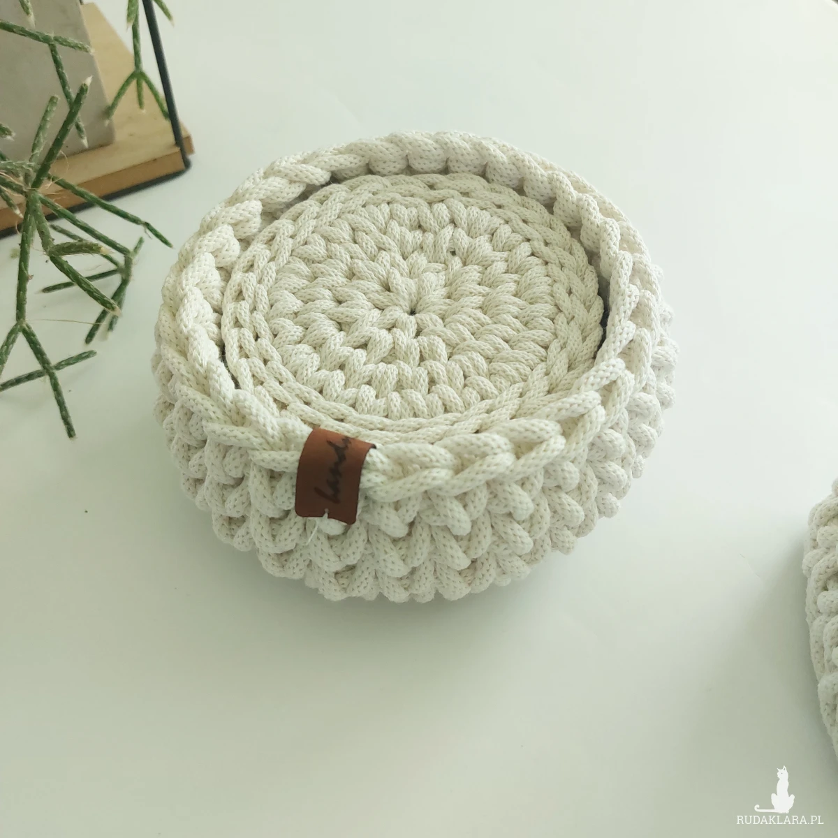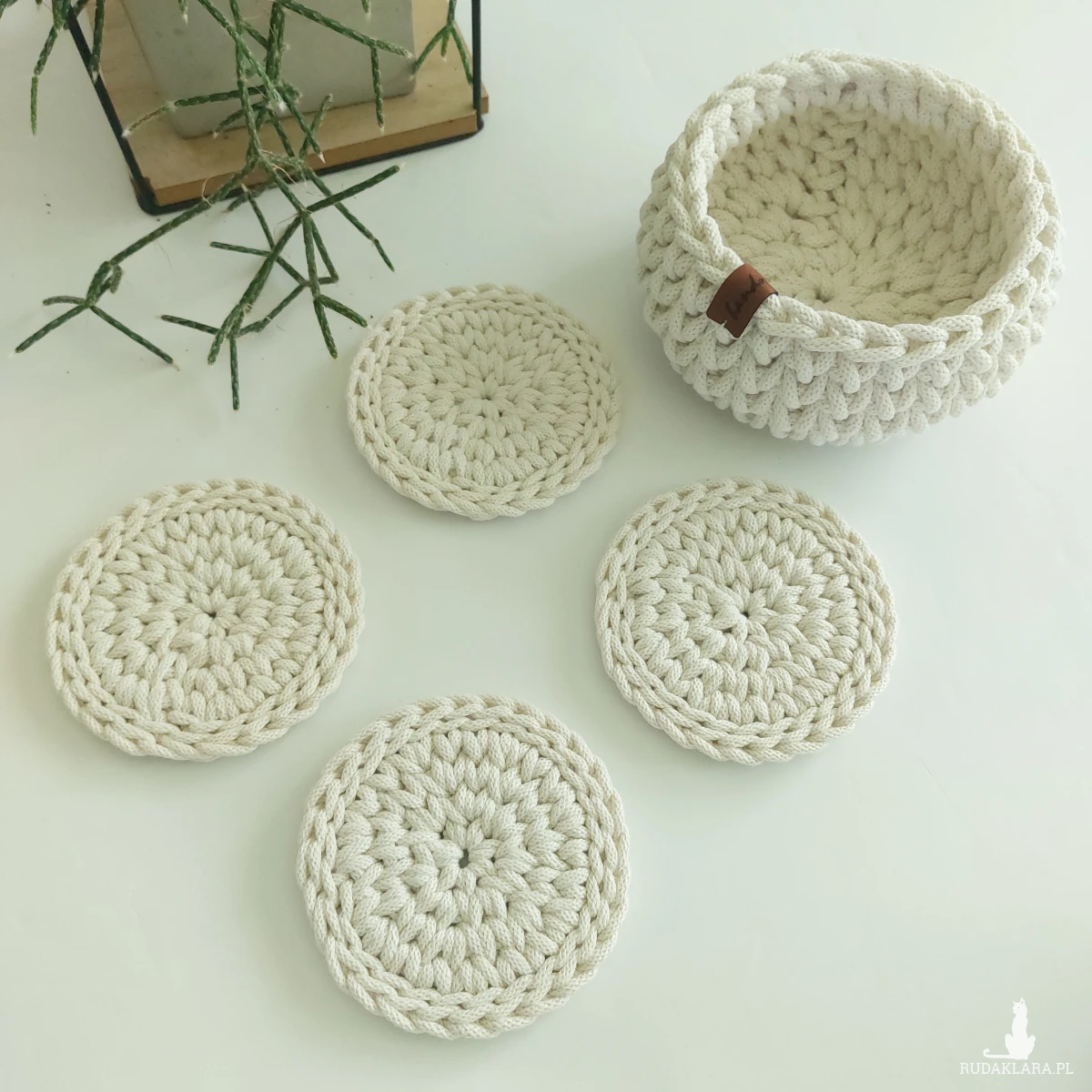 Do zaoferowania mam komplet podkładek pod kubek ( 4 szt) wykonanych ze sznurka bawełnianego o śr 3 mm w kolorze kremowym wraz z koszyczkiem do ich przechowywania. Koszyczek wykonany jest ze sznurka bawełnianego 5 mm.