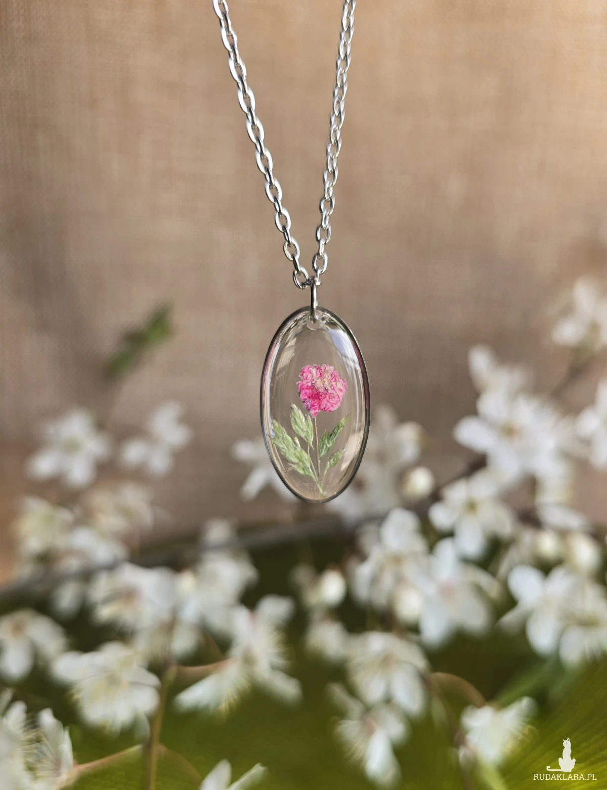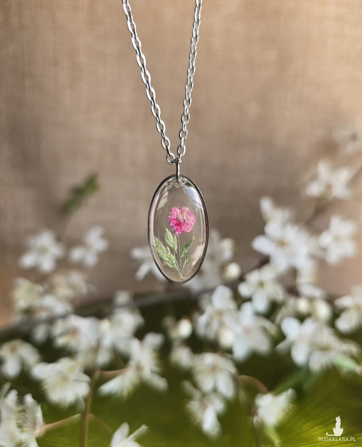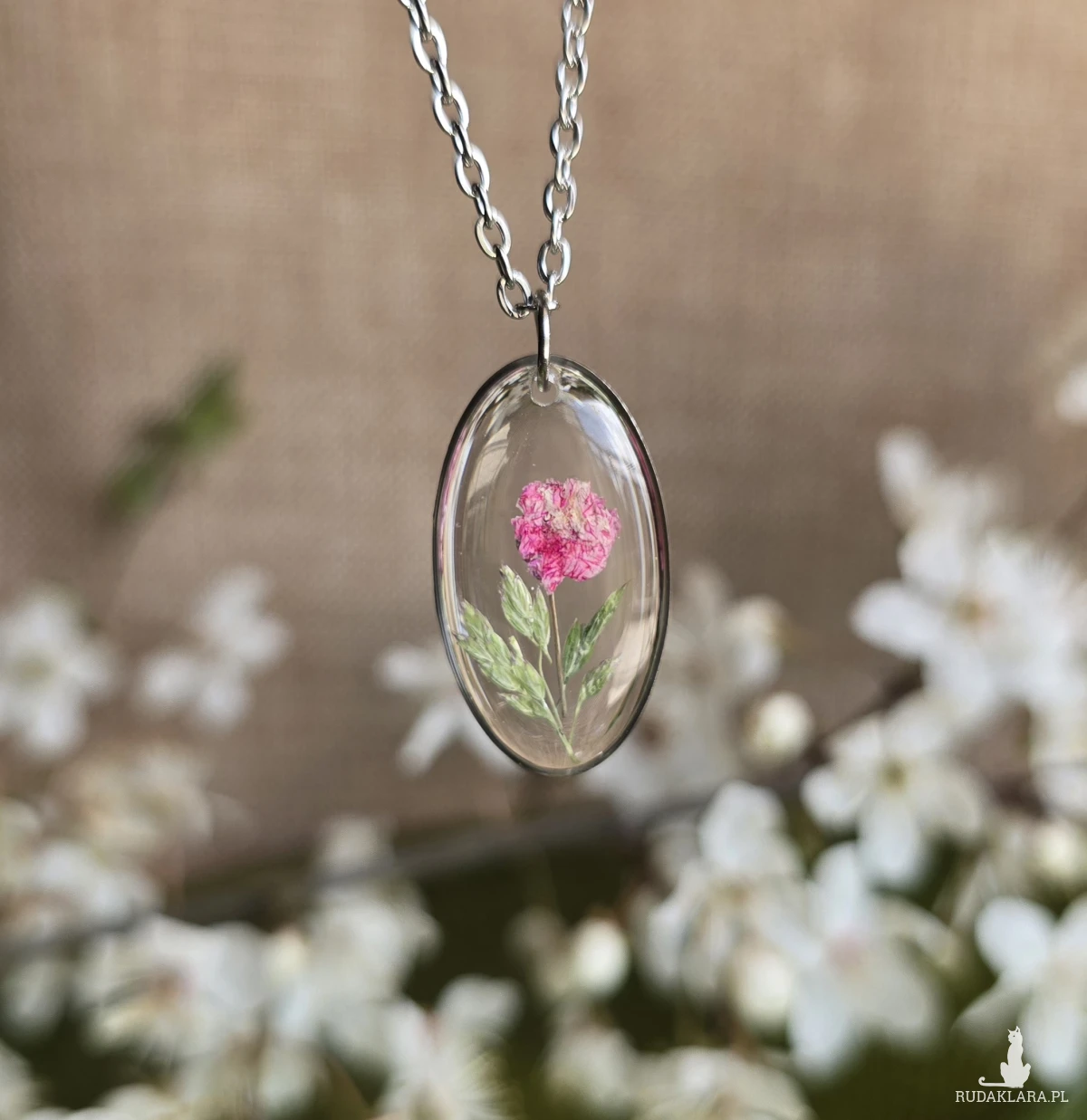 Oferuję Państwu unikalną biżuterię. Zawieszka jest wykonana z suszonych kwiatów i żywicy epoksydowej. Biżuteria jest wspaniałym i oryginalnym prezentem na lata.