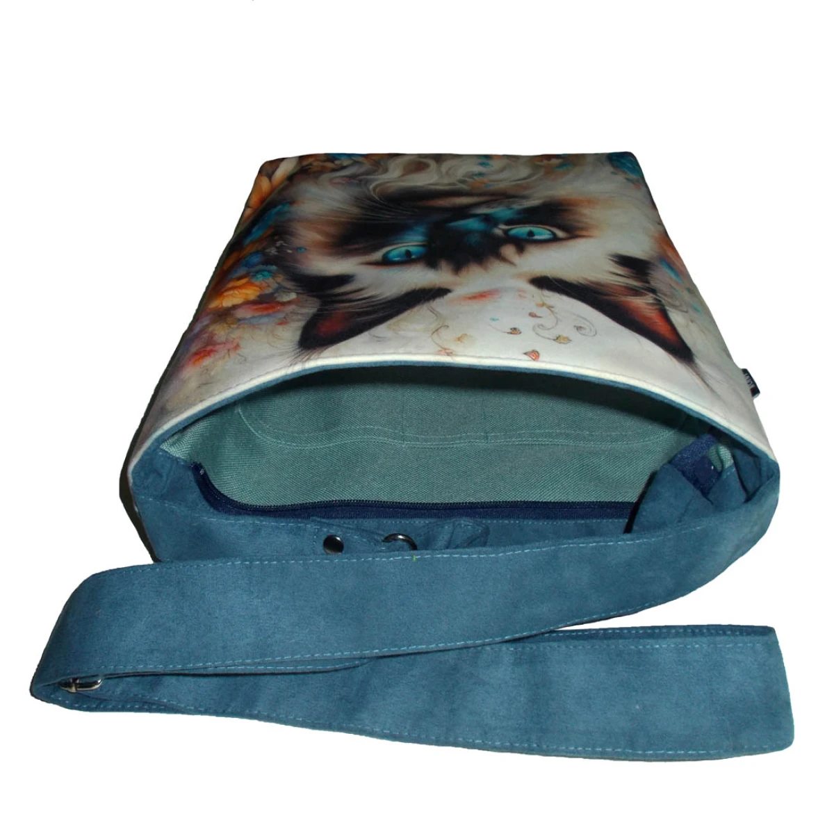 Autorska torba z usztywnionego eko zamszu, zapinana na zamek. Przód z weluru tapicerskiego. Pasek regulowany. Tył w korze paska (niebieski) Torba trzyma fason. Wewnątrz dwie kieszenie - jedna na zamek, druga z miejscem na telefon i coś jeszcze. W szwach wypustka. Denko poszerzone. szerokość 32cm wysokość 30cm plus denko 8cm