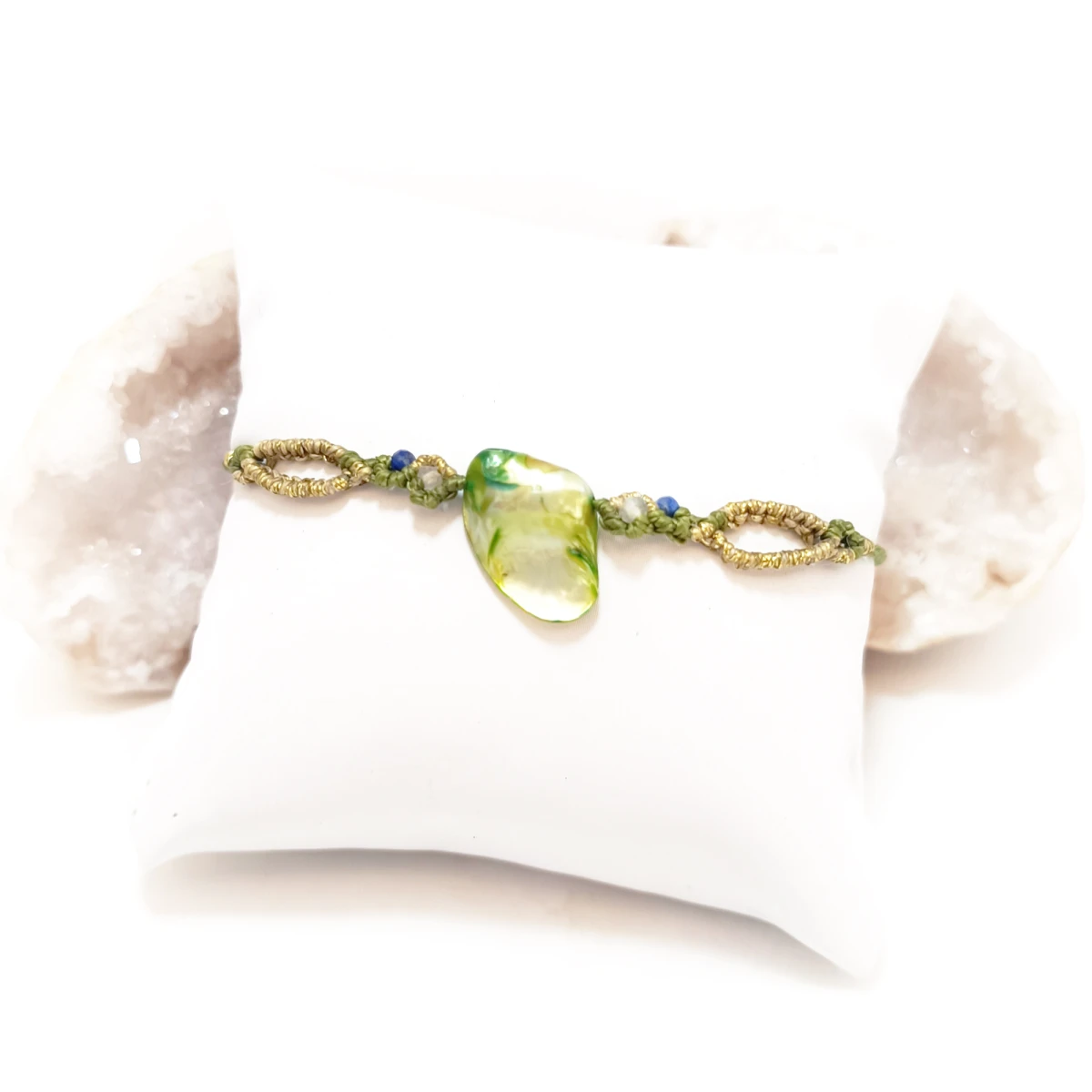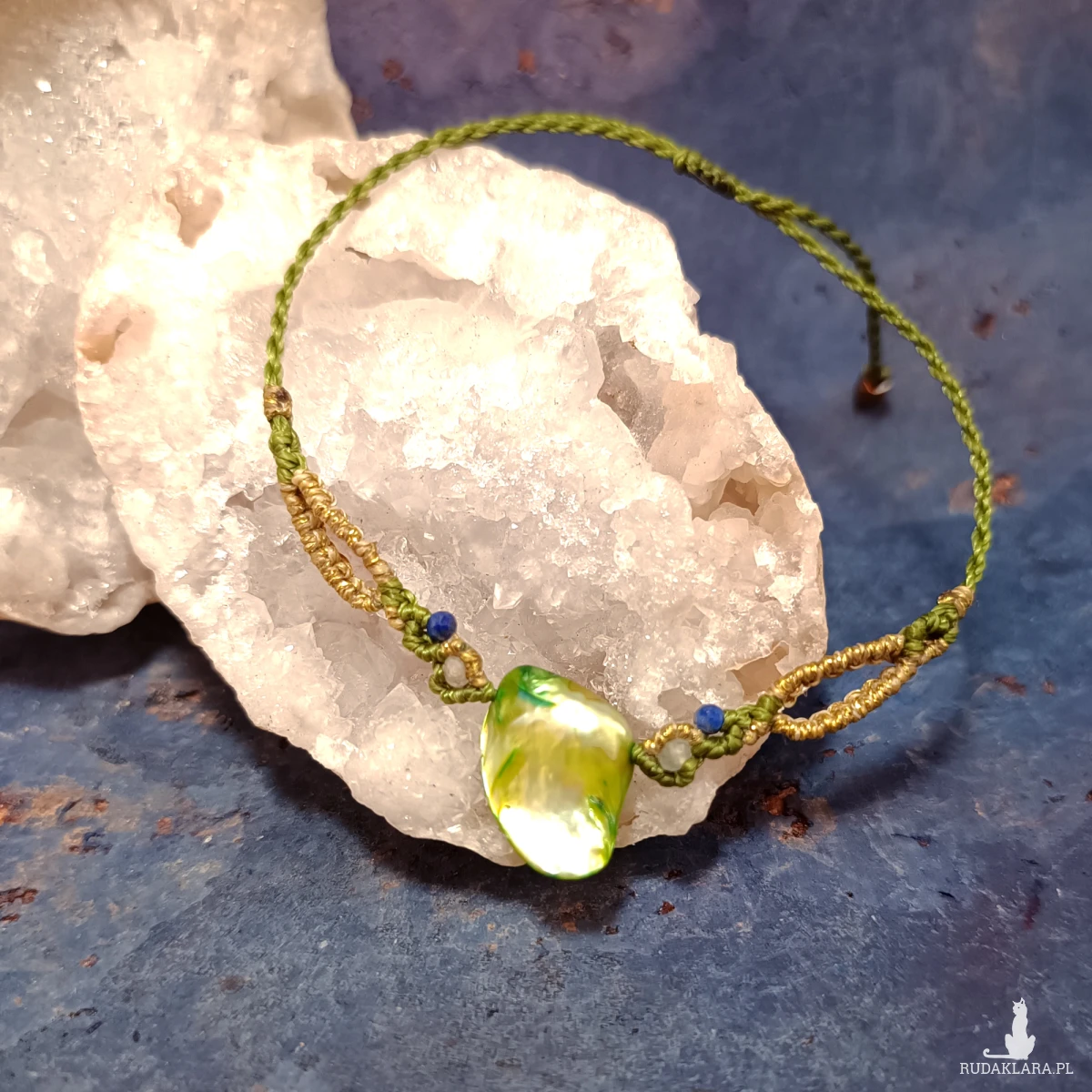 Bransoletka " Aquatic Plant " jest autorskim rękodziełem. Mikromakrama w połączeniu z naturalnymi kamieniami jest biżuterią elegancką, ciepłą w dotyku, lekką i przyjemną w noszeniu na co dzień i do wyszukanej kreacji.
