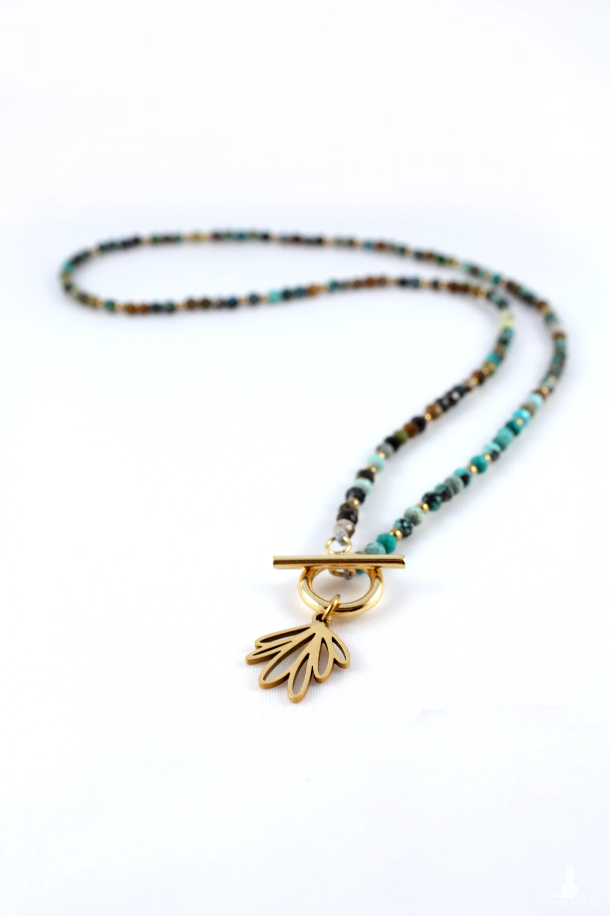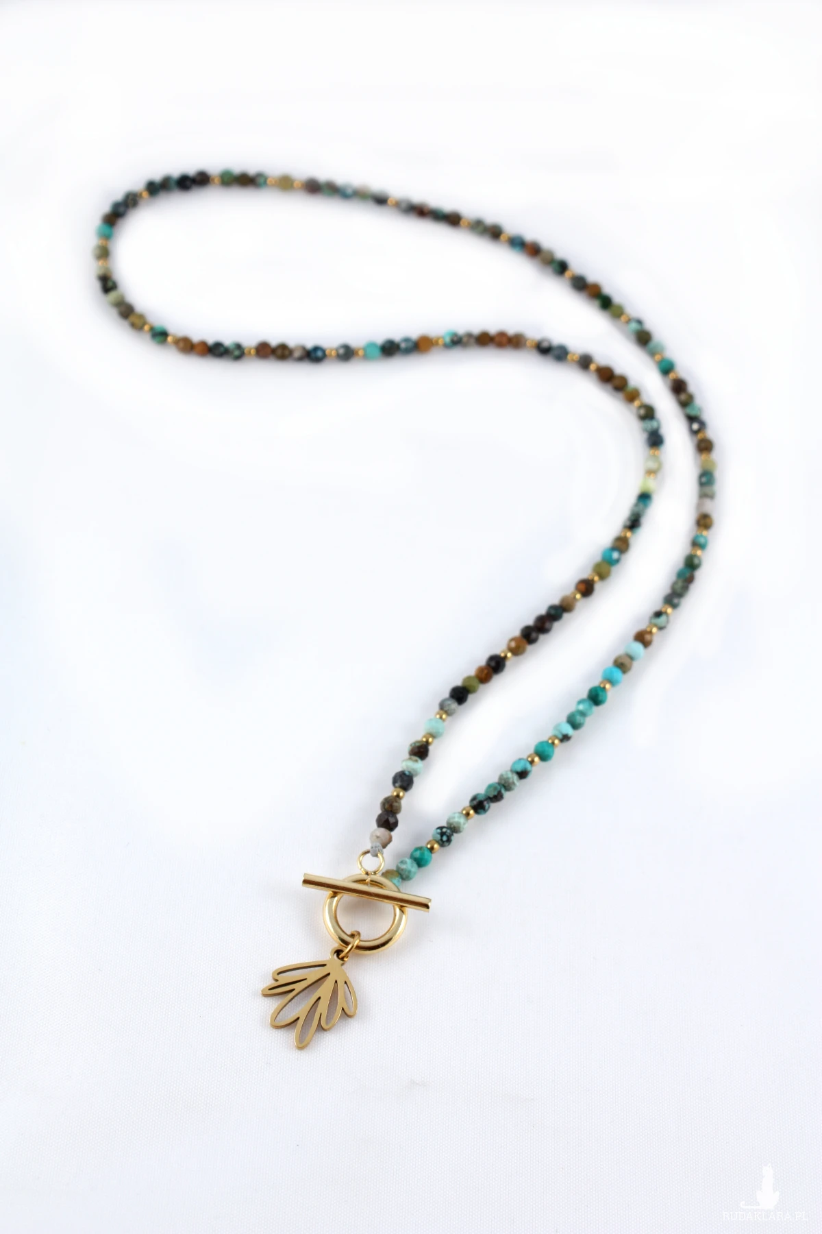 Naszyjnik z wygodnym zapięciem Toggle wykonany z fasetowanego turkusu i hematytów w kolorze złota. Turkusy użyte w naszyjniku są wielobarwne i posiadają charakterystyczne dla tego kamienia wtrącenia i żyłki, co czyni naszyjnik jeszcze piękniejszym i unikatowym. Drugiego takiego samego nie ma na całym świecie :-)