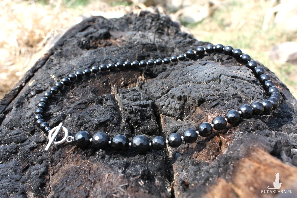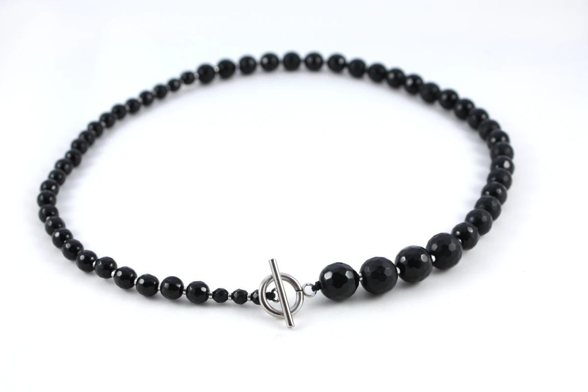 Naszyjnik łączący prostotę i piękno. Idealnie fasetowane kulki onyksu o różnych wielkościach ułożone od najmniejszych do największych, bądź odwrotnie, są doskonałym, wyraźnym dodatkiem do stylizacji. Długość naszyjnika to ok 47 cm. Zapięcie toggi jest wygodne i łatwe do zastosowania. Wszystkie metalowe dodatki to szlachetna stal chirurgiczna, w kolorze srebra, która nie uczula skóry.